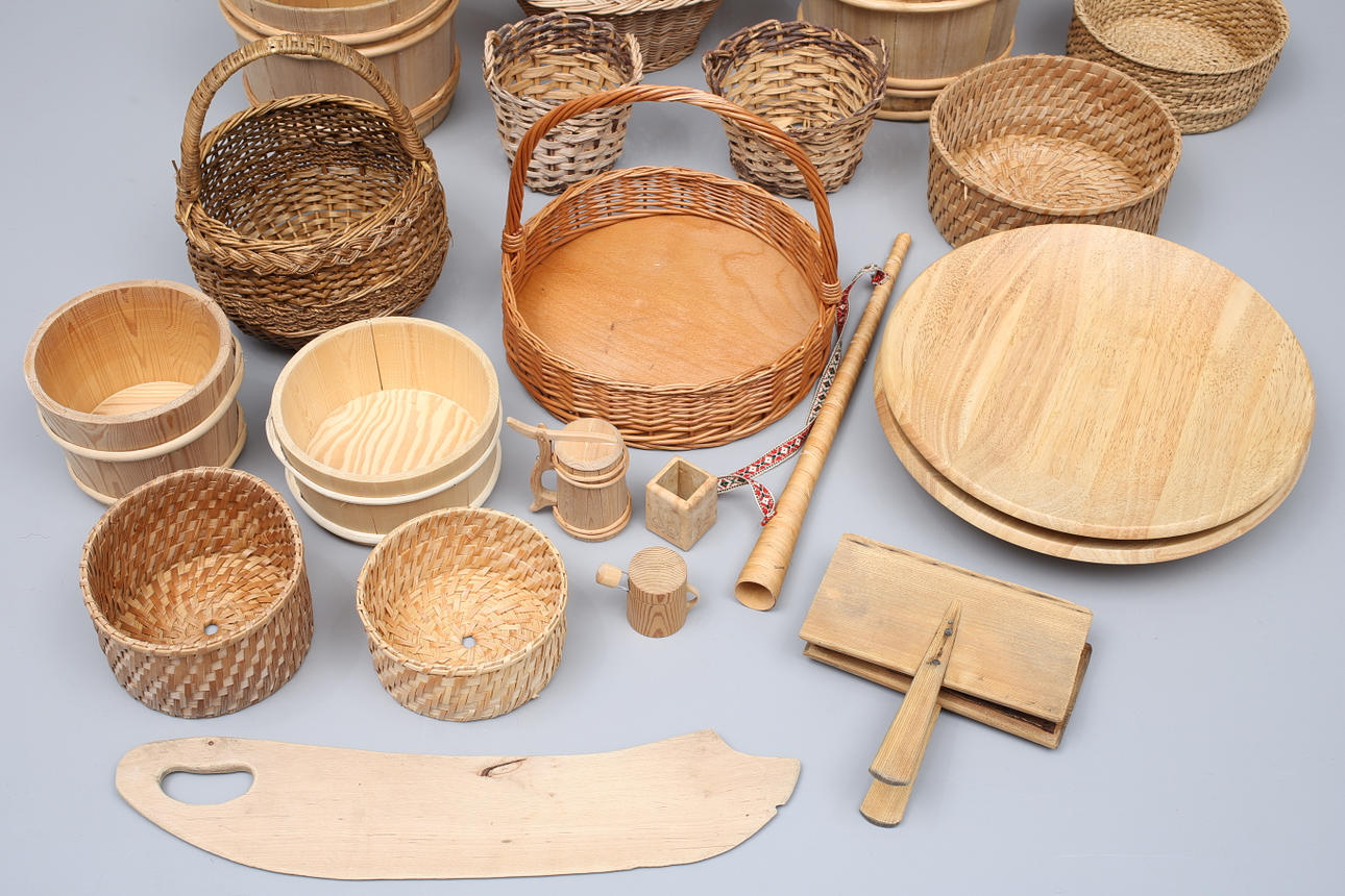 4 ostekurve, 4 stykker træ, 8 kurve, bøjletræ, horn, kort og tre små trædetaljer.