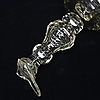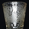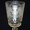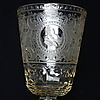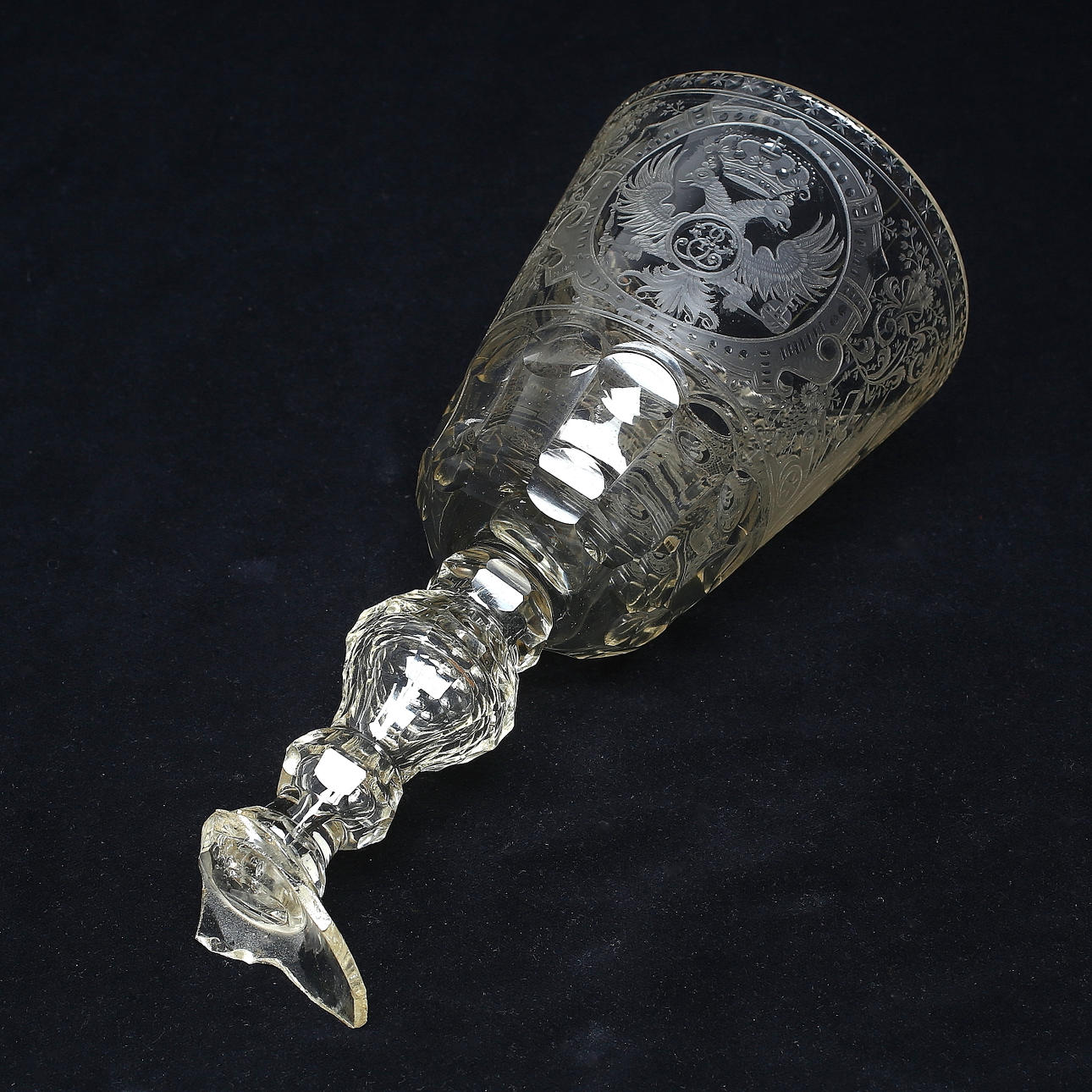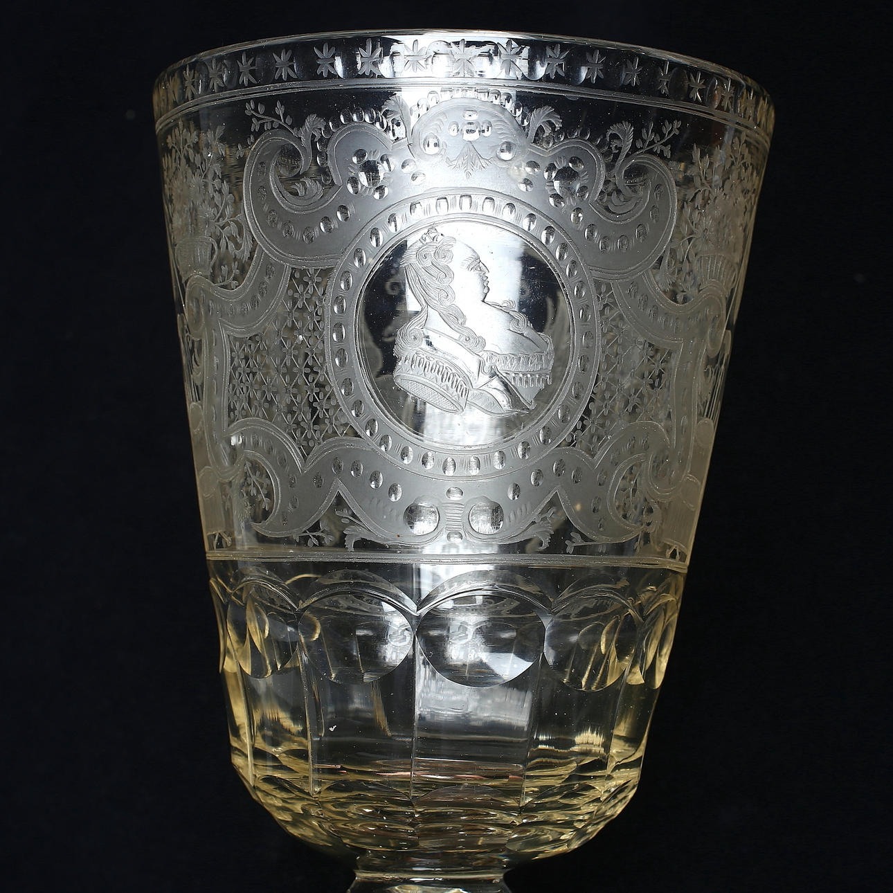 Graveret dekoration af blandt andet en dobbelthovedet ørn, portræt af en dame, blomster og planter og monogram.