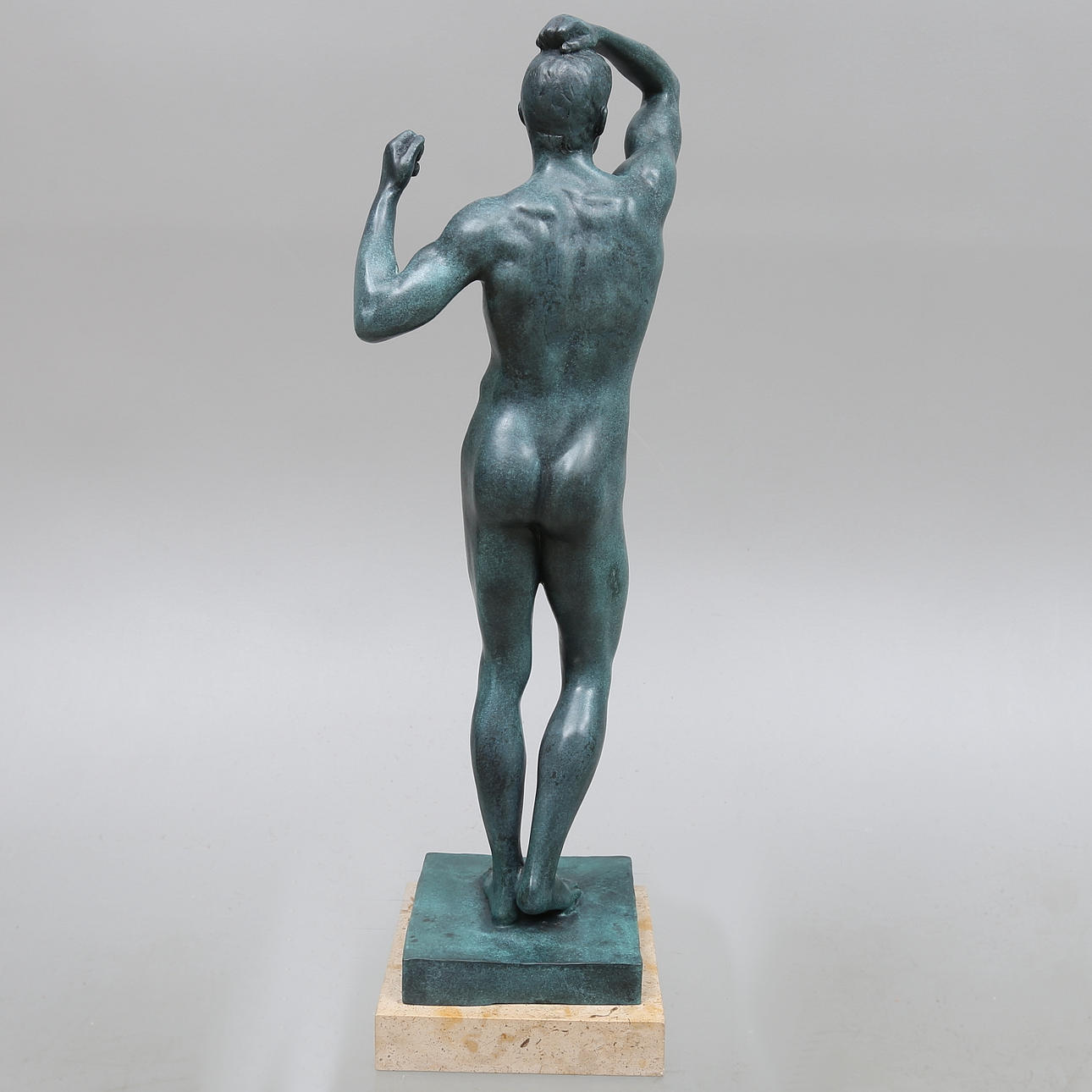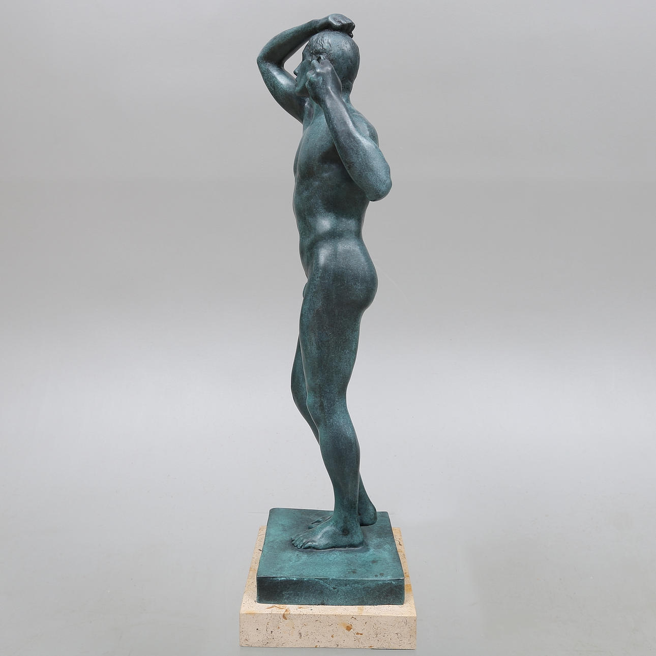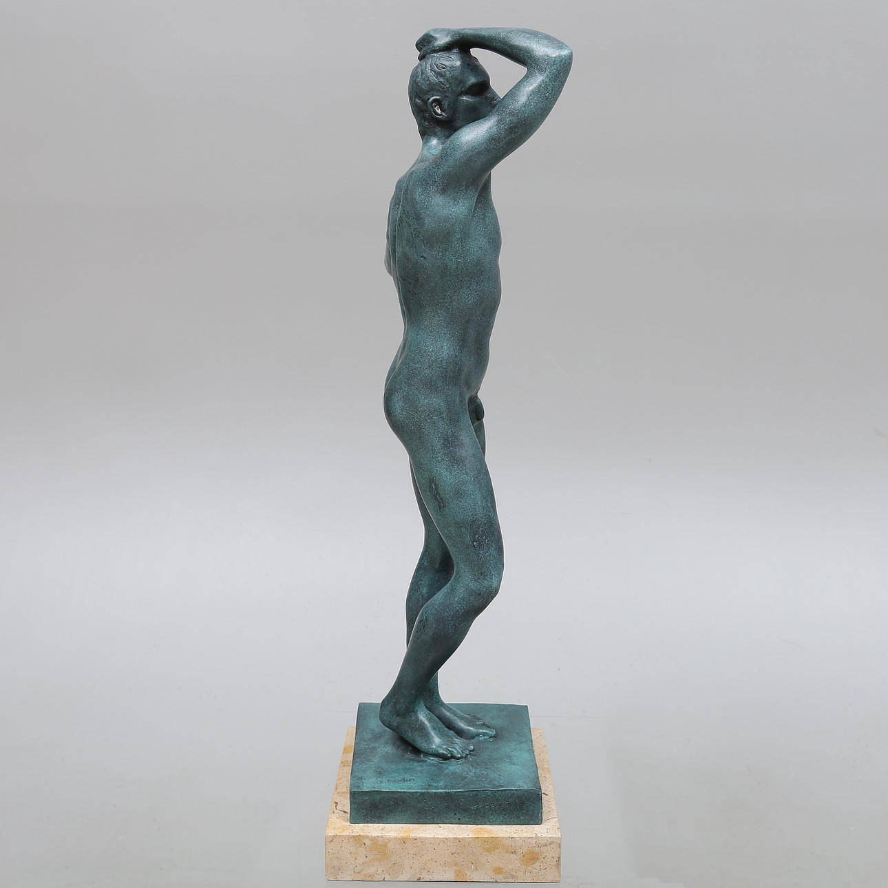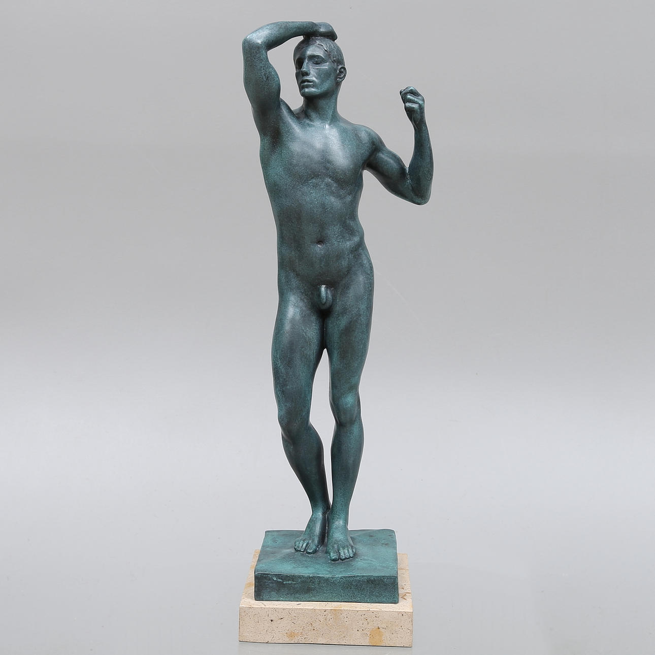 Stående mand. På sokkel af sten. Højde 51 cm (54 cm inkl. sokkel).