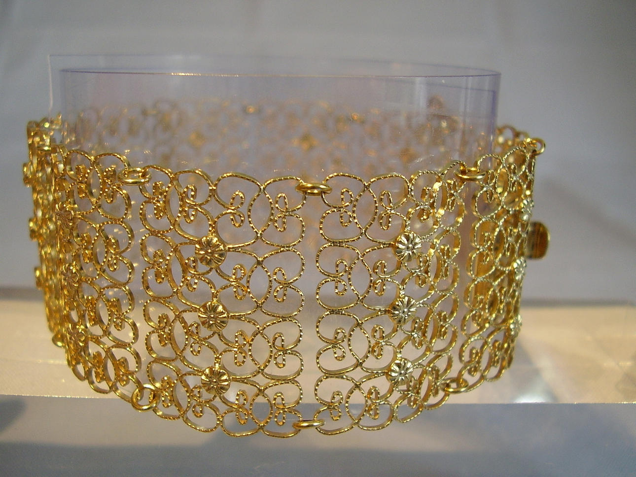 Fremstillet af ti let buede led bearbejdet i filigranteknik, som er fleksibelt forbundet med hinanden.