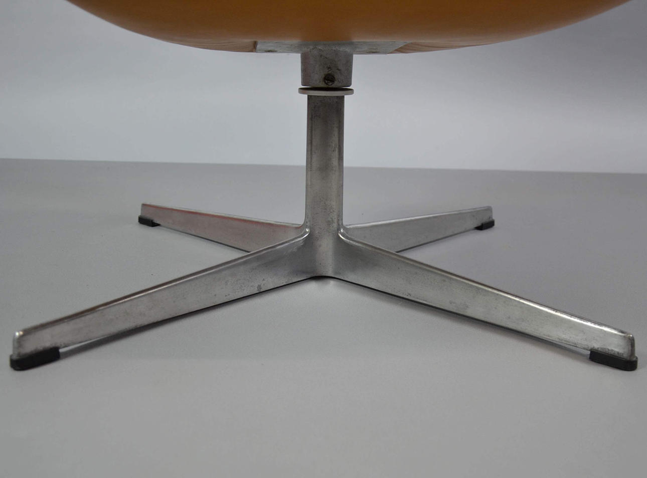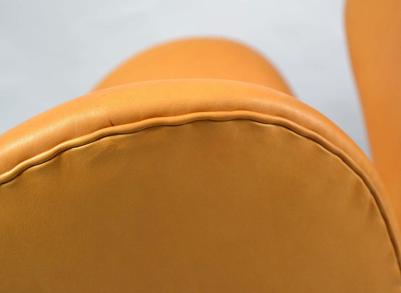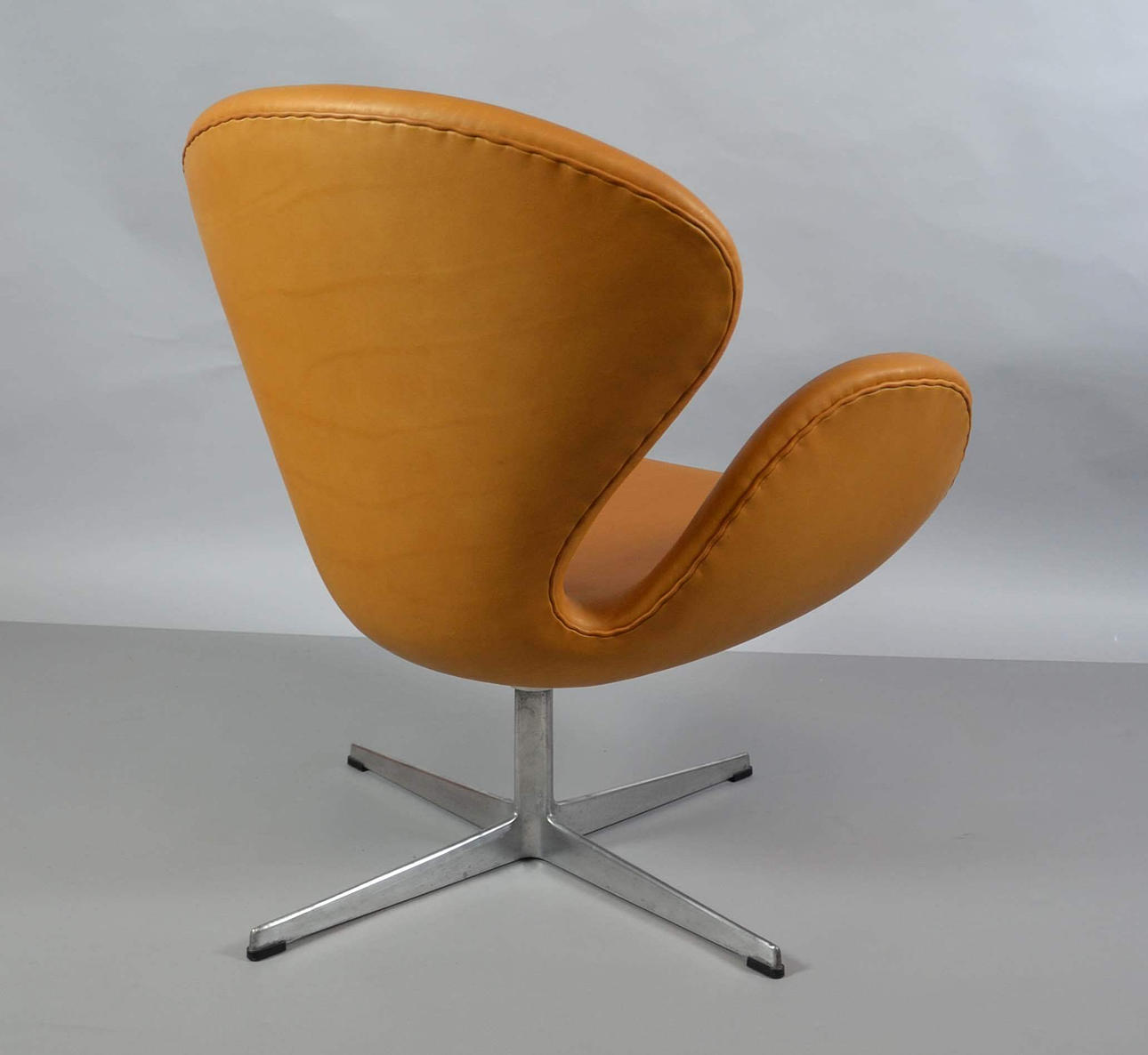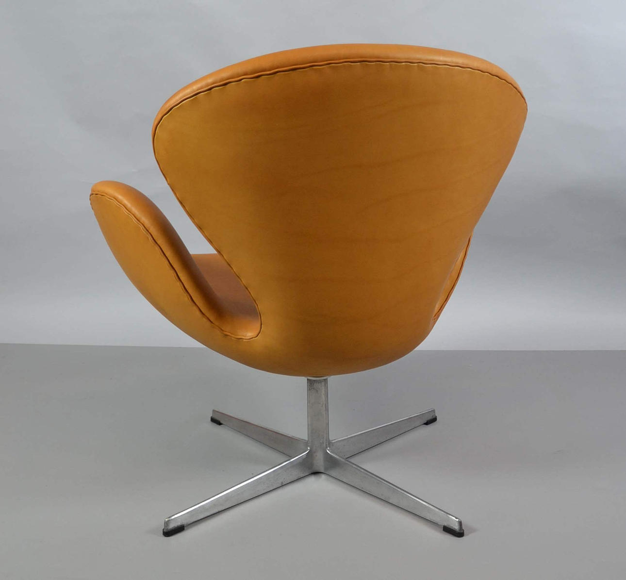 Design: Arne Jacobsen fra 1958 Producent: Fritz Hansen Model: svanestol Udførelse ca. 1960'erne Stolen er nybetrukket med cognacfarvet anilin læder.