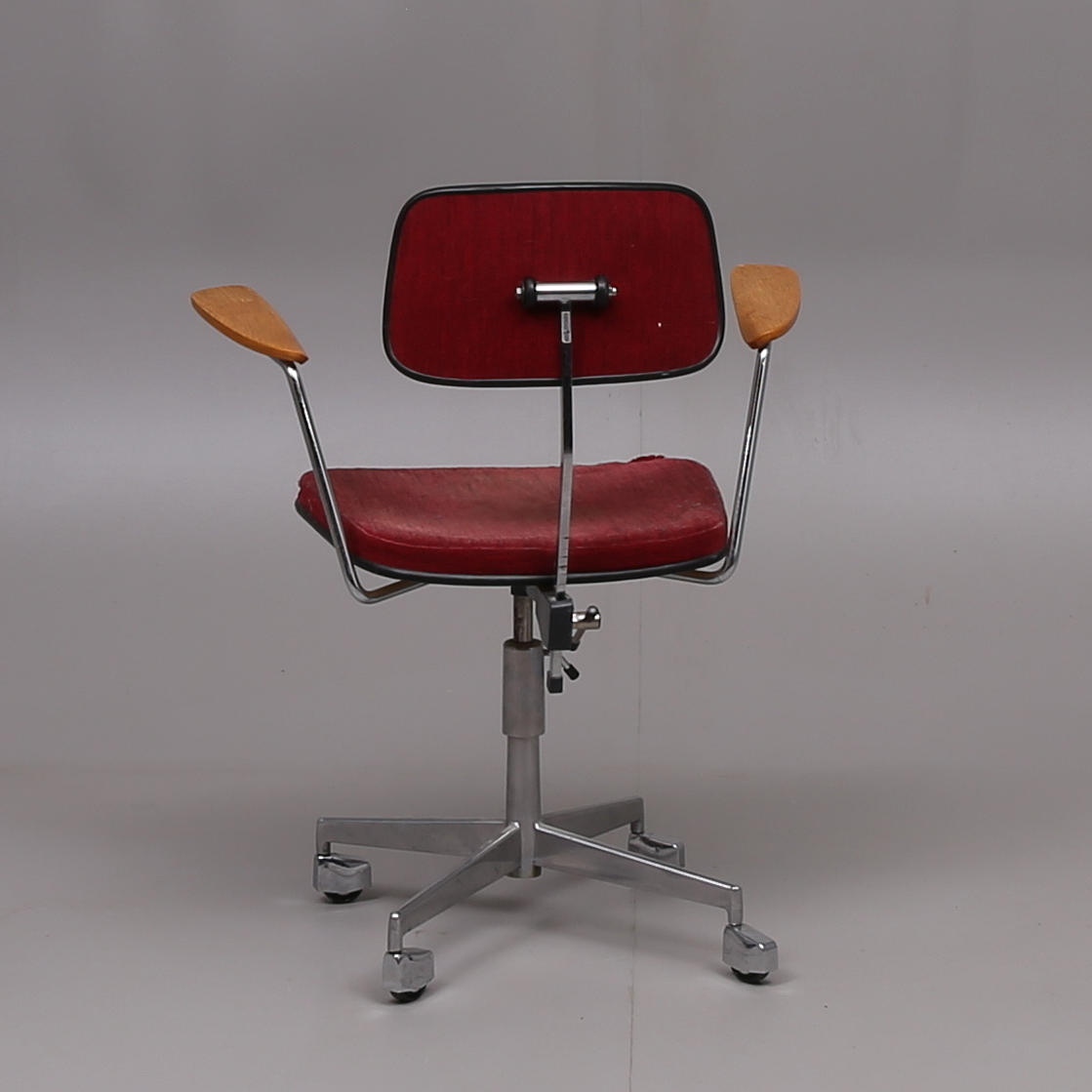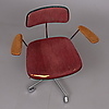 Labofa. Kontorstol betrukket med bordeaux stof, højdejusterbart stel af forkromet stål, egetræsbeklædt armlæn, udført på hjul. 1960'erne / 70'erne.