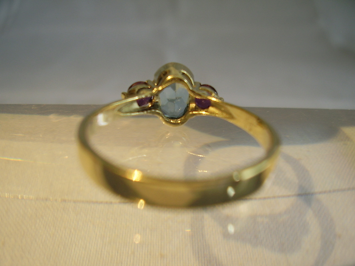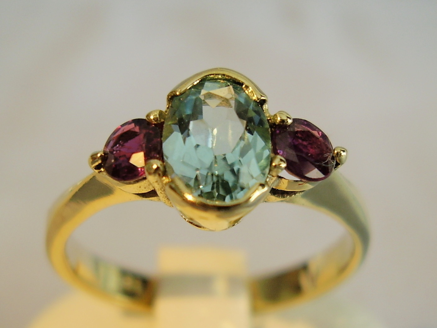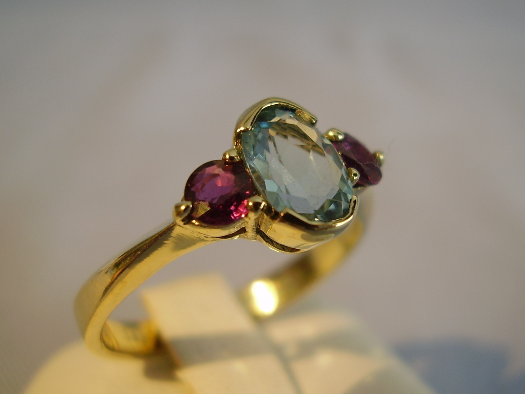 702620. RUBY - BLÅ TOPAZ RING 14 KARAT.