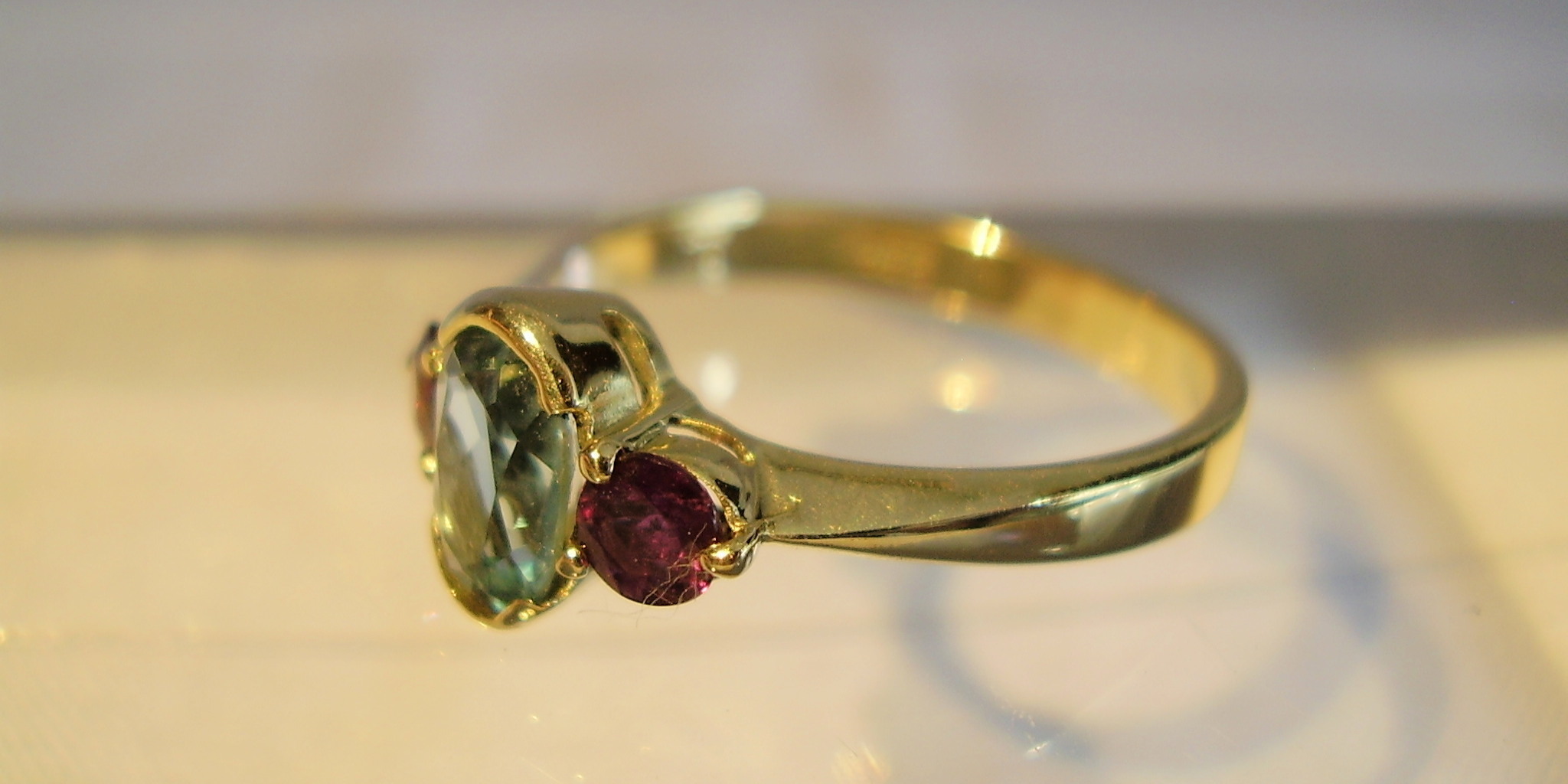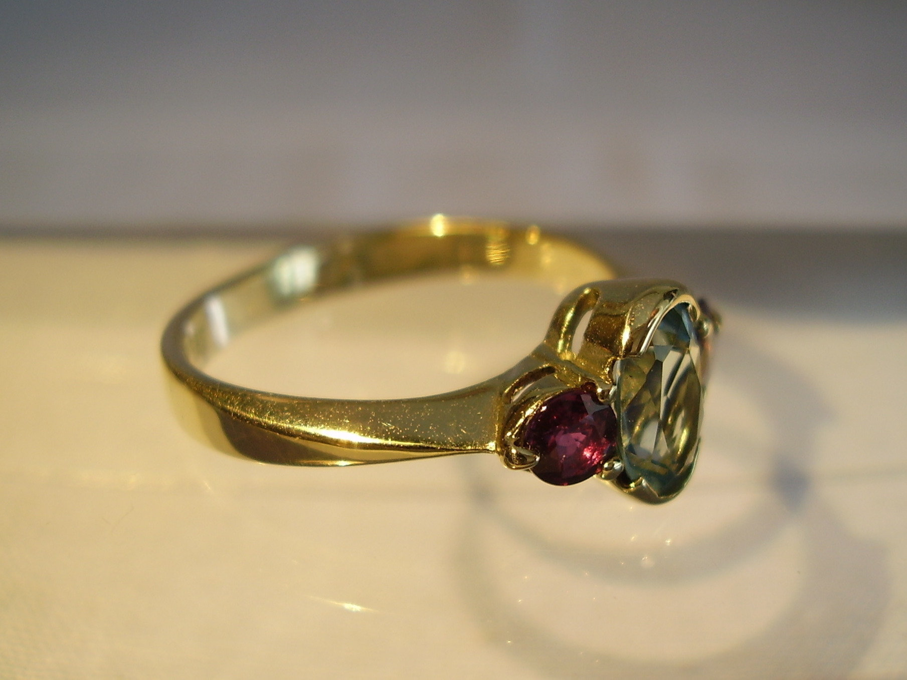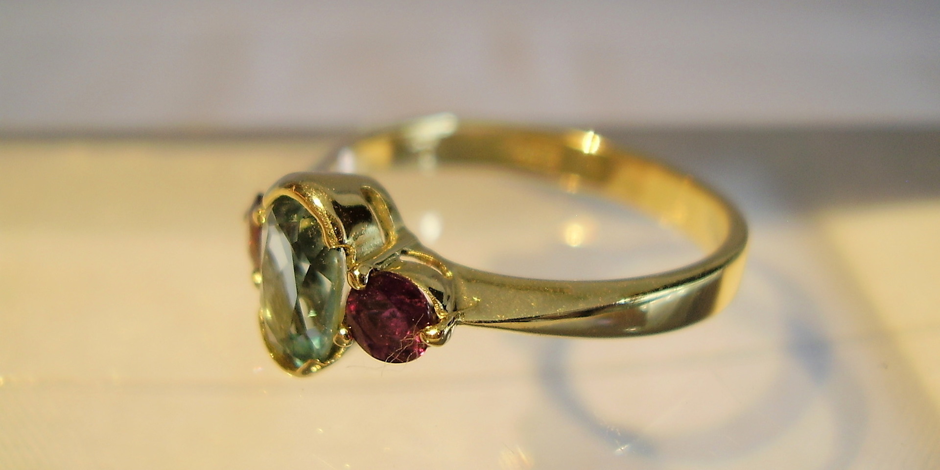 702620. RUBY - BLÅ TOPAZ RING 14 KARAT.