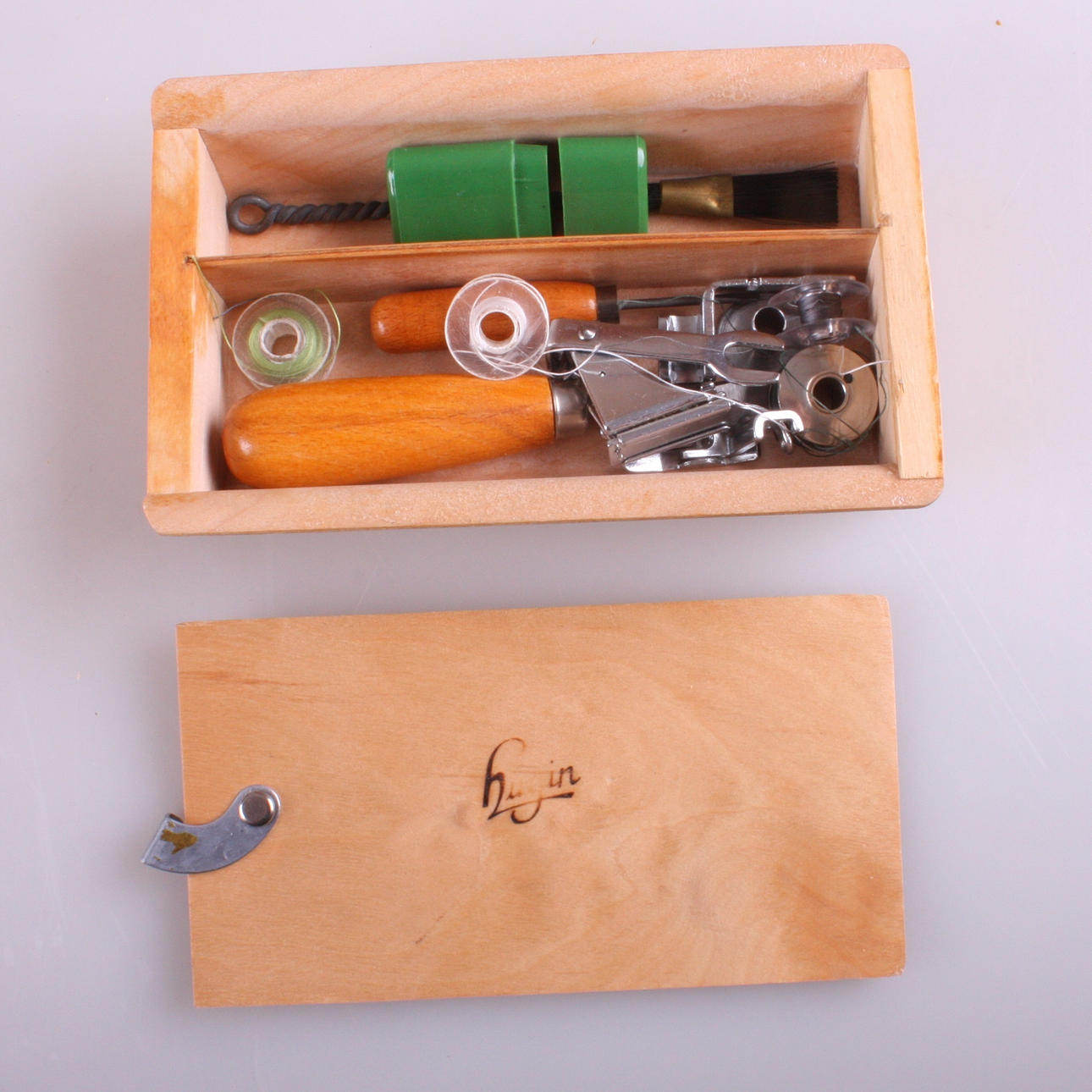 Symaskine Hugin med tilbehør og tilhørende taske.