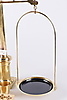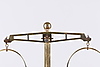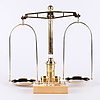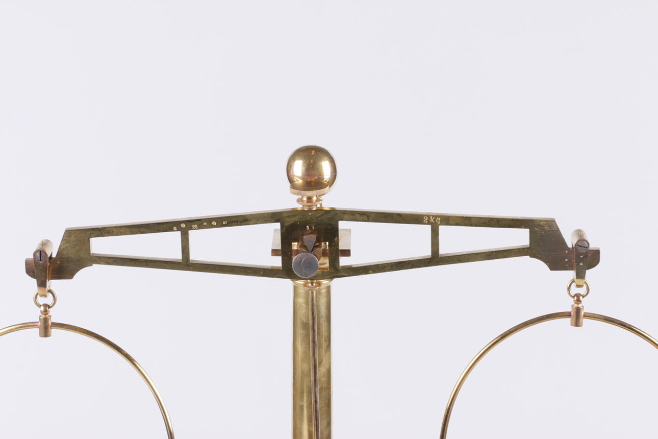 Apoteksvægt i messing med tilbehør som to kopper, vægtsæt og blybolde Vægtmål, længde 54, bredde 17, højde 51 cm.