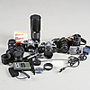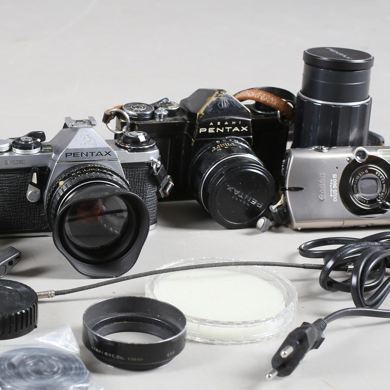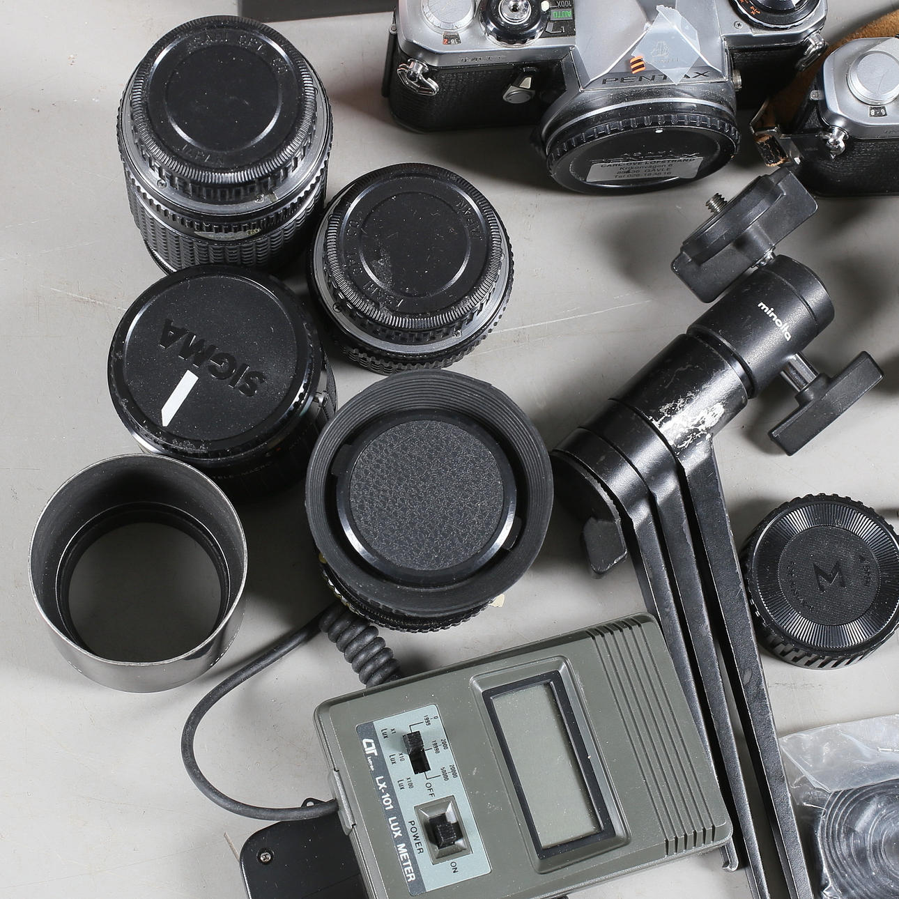 1 objektiv, SMC Pentax-M 1:1,8 28 mm. 1 objektiv, Super-Takumar 1:3,5/135 mm. 1 objektiv, Vivitar 400mm 1:5.6 Auto Telephoto.