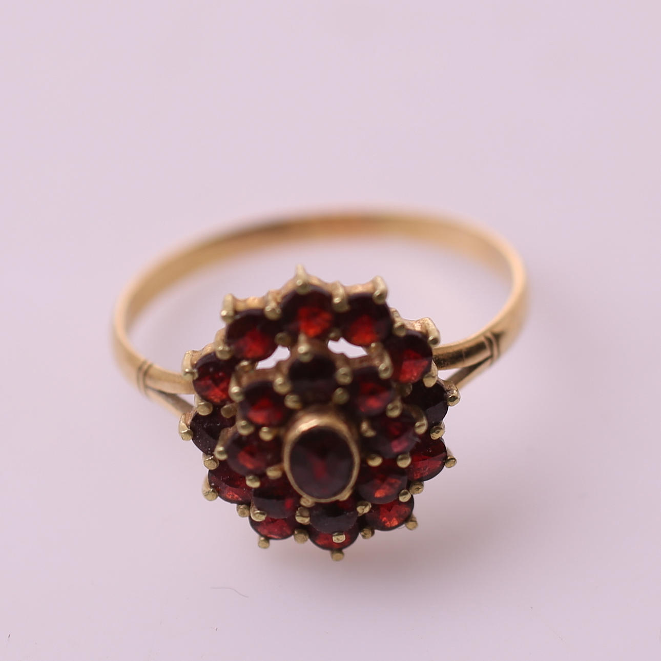 Ring med granater, guld 18k, diameter 20 mm, vægt = 4,0 gram.