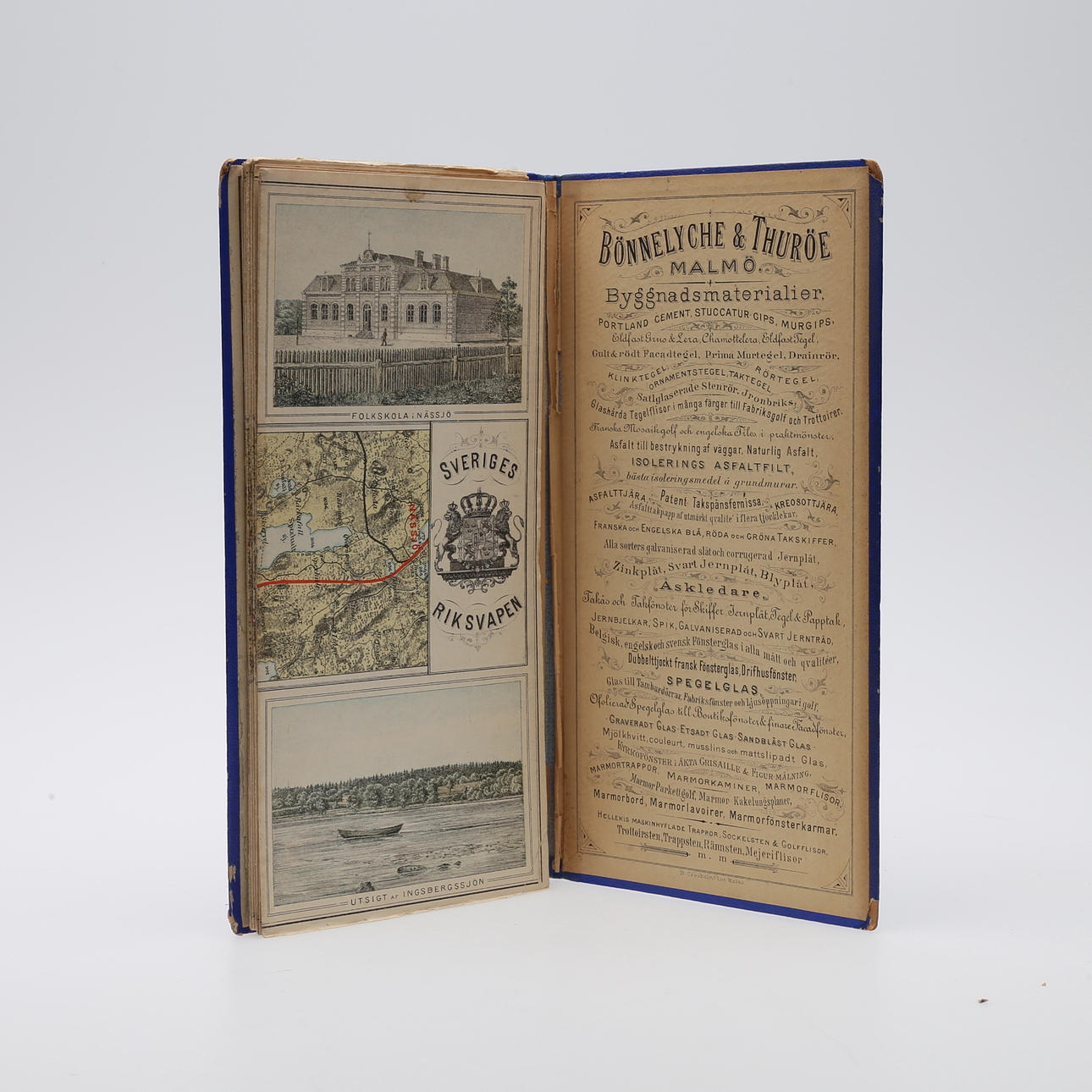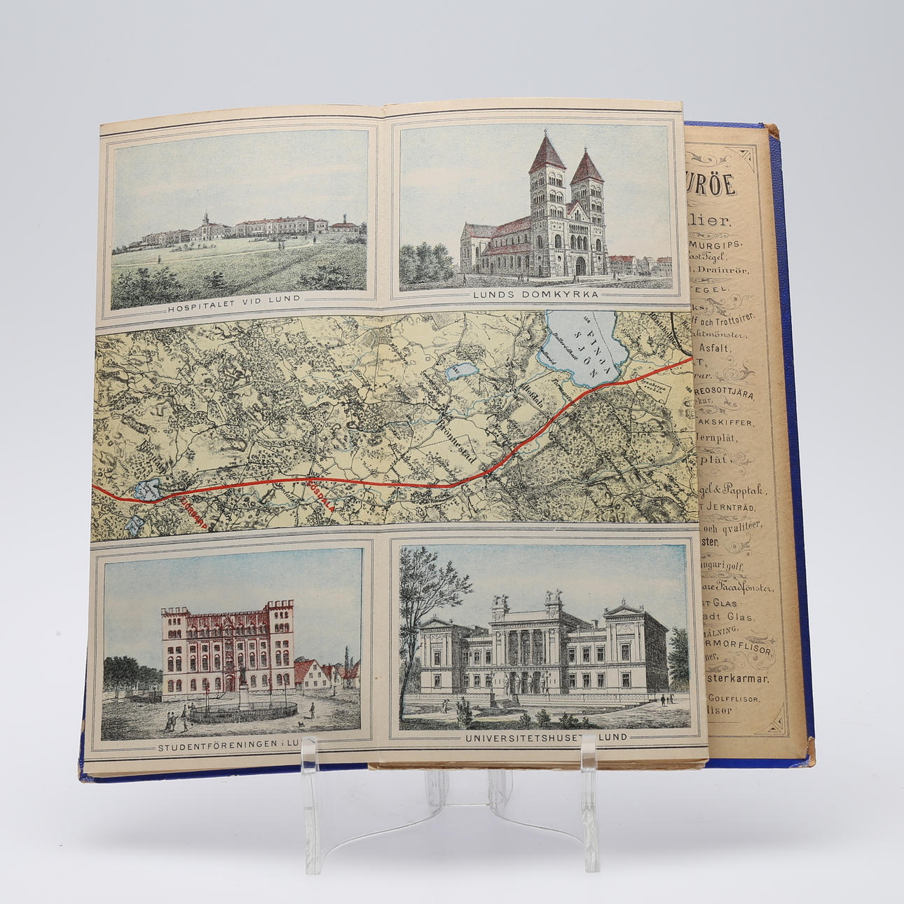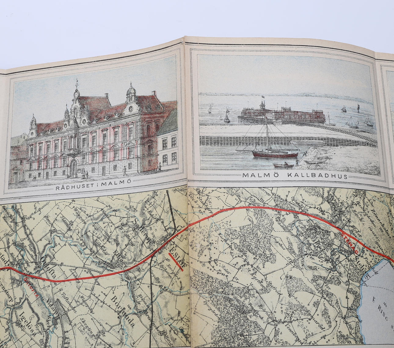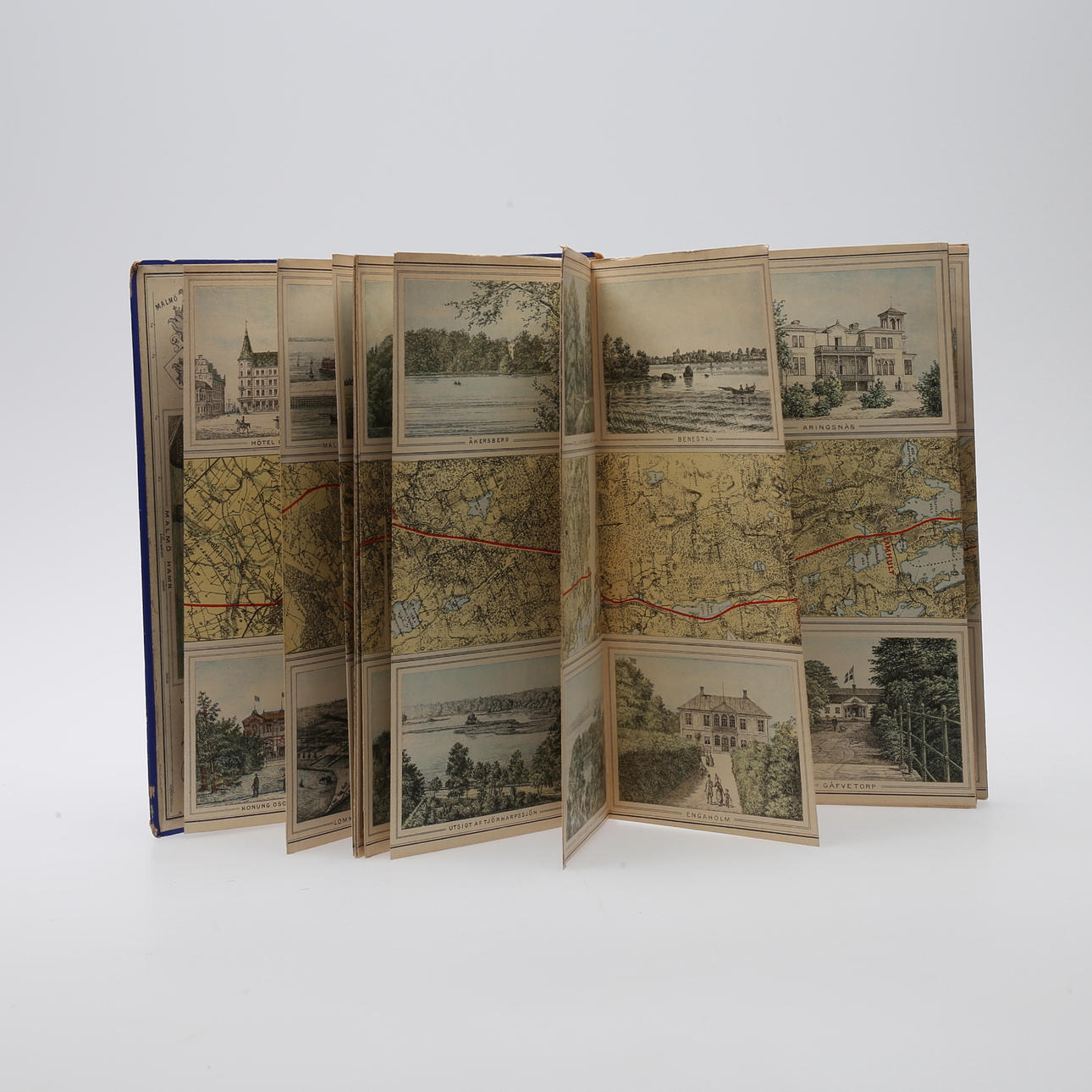 Illustreret jernbanekort Malmø-Nässjö uden årstal (1887.) 24 x 275 cm, leporello (fold-ud) kort med farvelitografiske udsigter langs ruten. Forlagets blå kuglebind med rig gulddekoration på forsiden.
