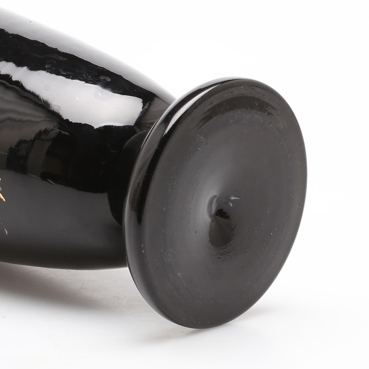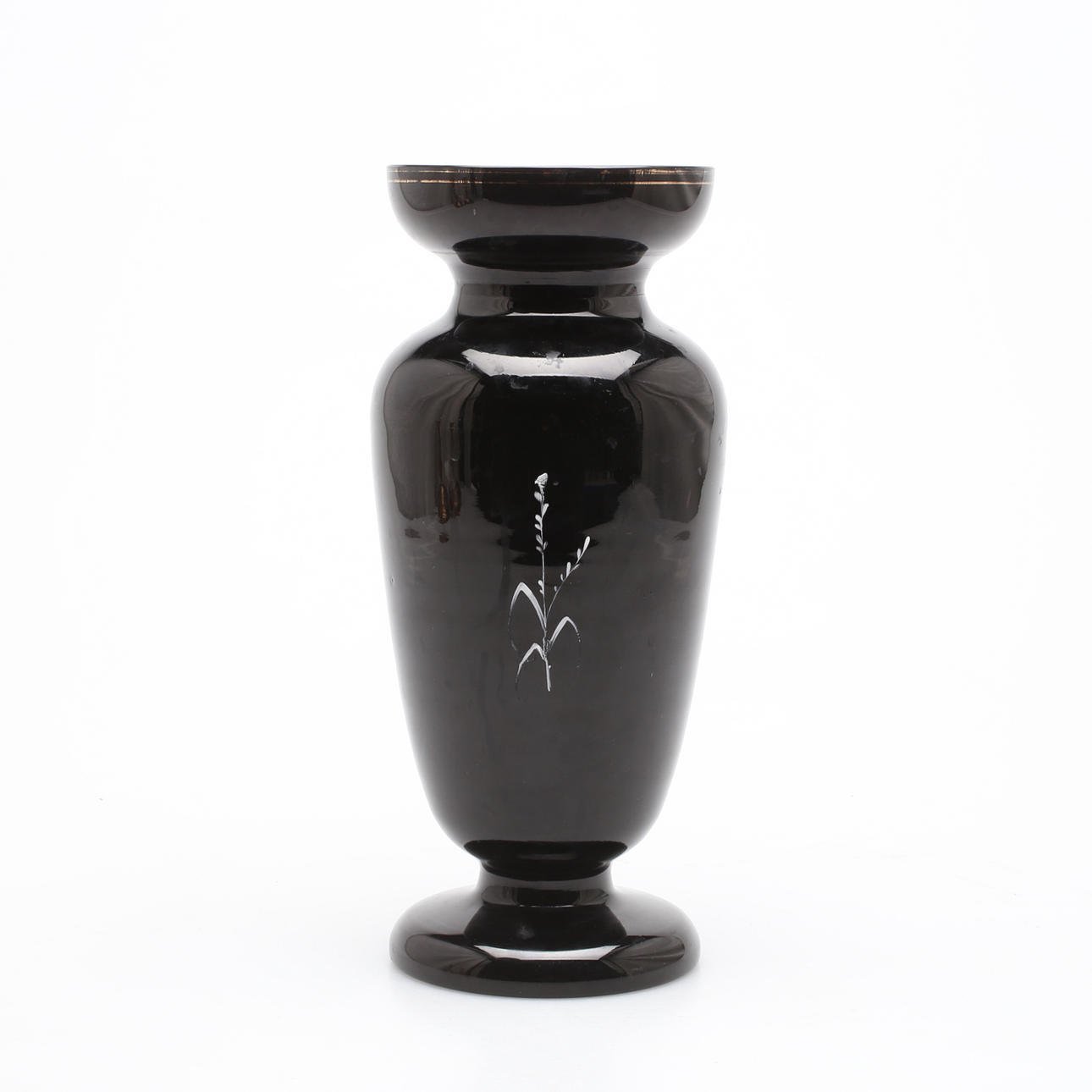 Vase i dybt lillatonet glas med emaljemalet motiv i hvid.