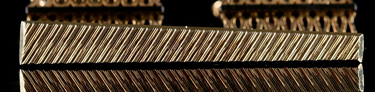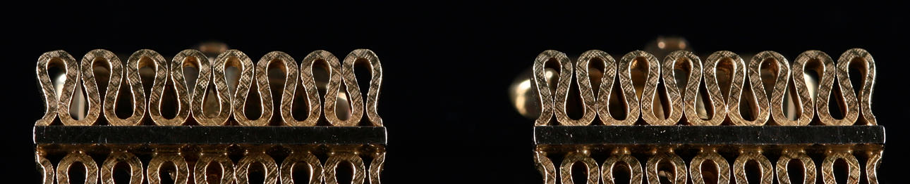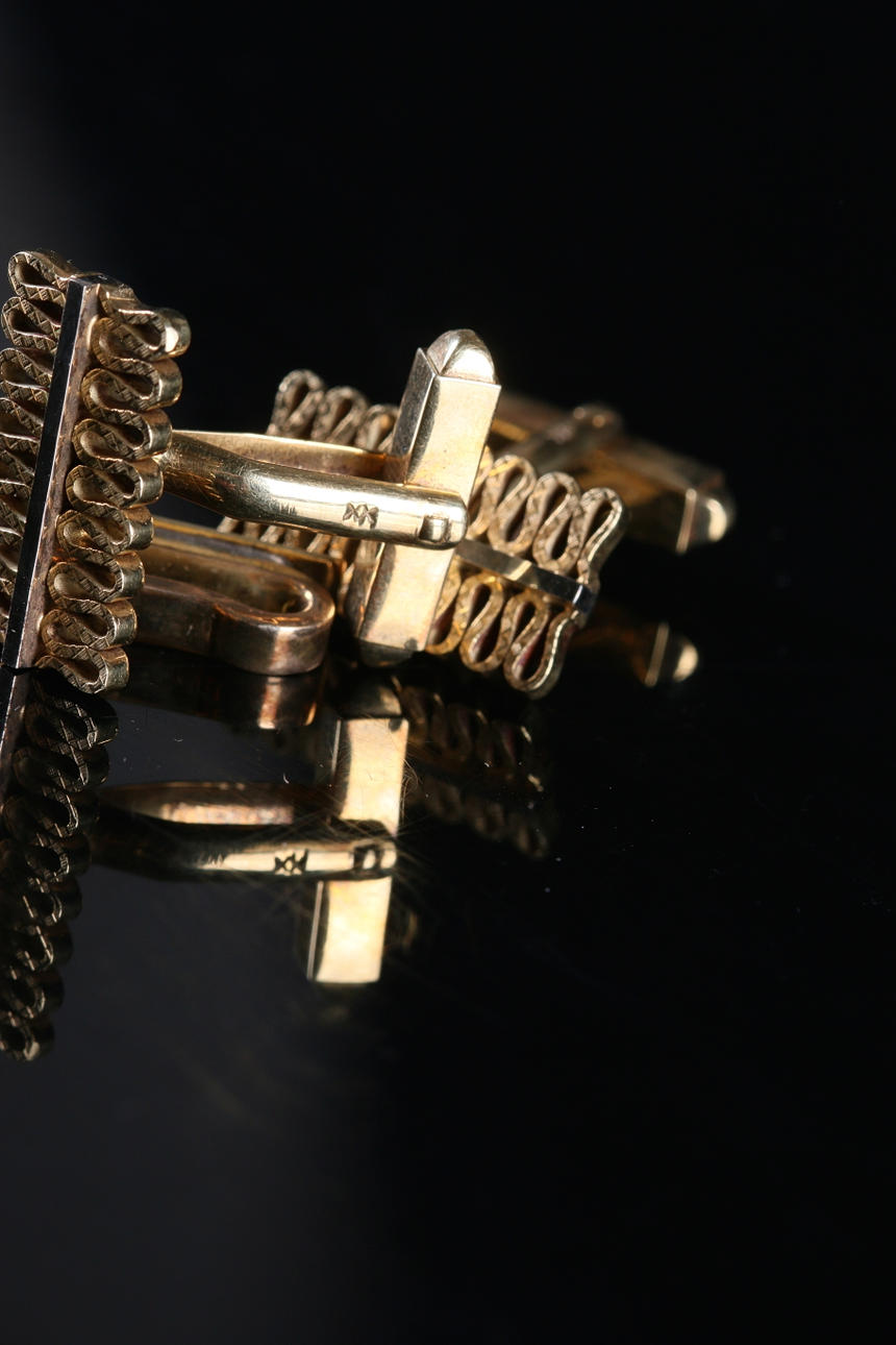 Manchetknapper i gul- og hvidguld, længde 2, bredde 1 cm Slipsnål med clips i forgyldt metal og dekorationsplade i relief i 14k guld, længde 4,8 cm Vægt 18,86 gram, inklusiv clipsen på slipsenålen.