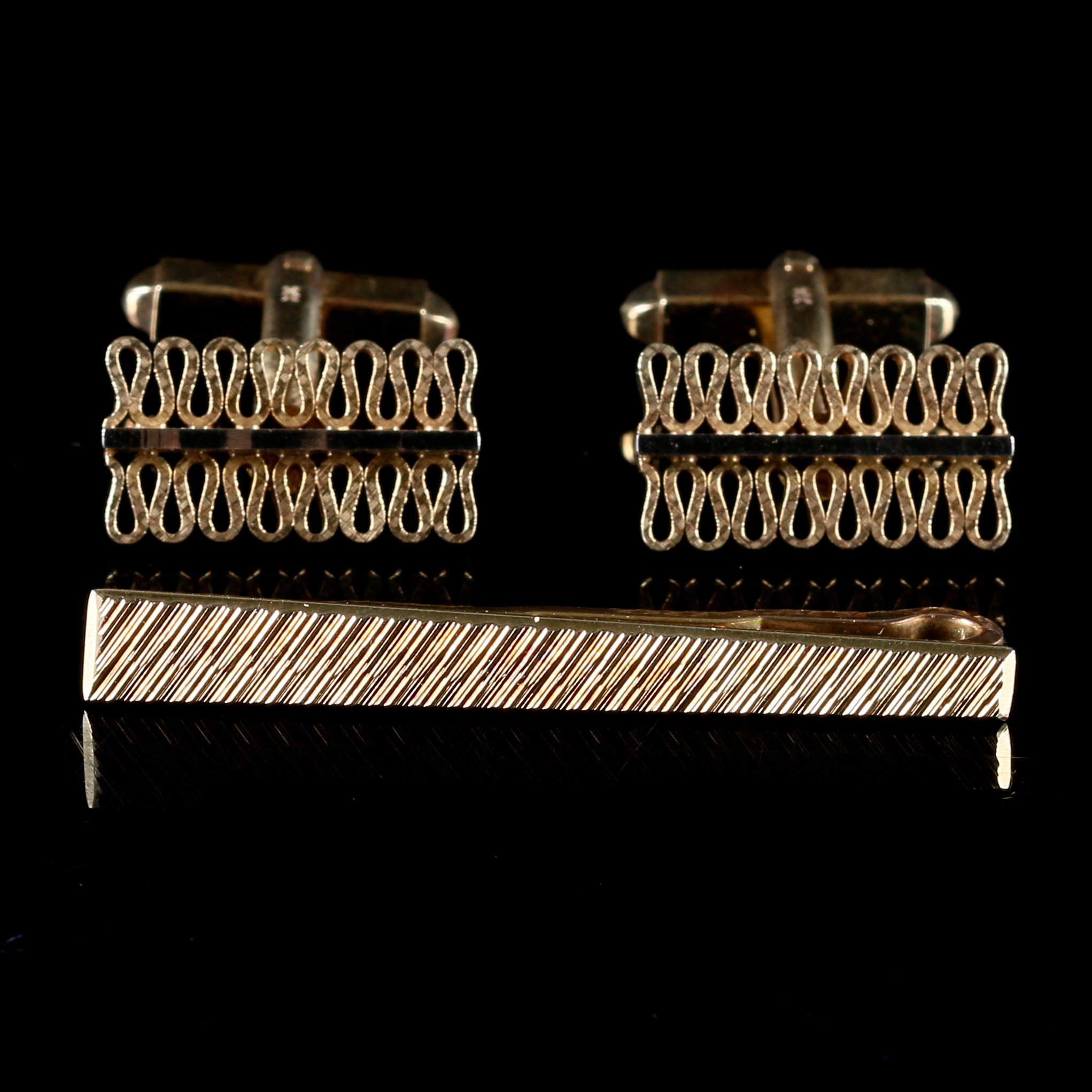 742755. MANCHETSLINDE og slipsenål, 14 karat guld, 1900-tallet.