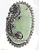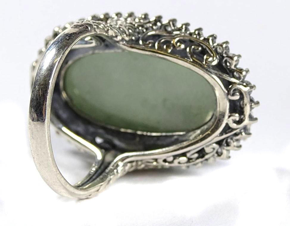 Solid ring lavet af 925 sølv, denne er sat med en poleret jade plade, omgivet af funklende diamantslebne zirconia indfatning, en lille rubin påført på siden af Ming dragen som øje, ringstørrelse 56, ringhoved 34 x 20 mm, vægt 13,2 gram.