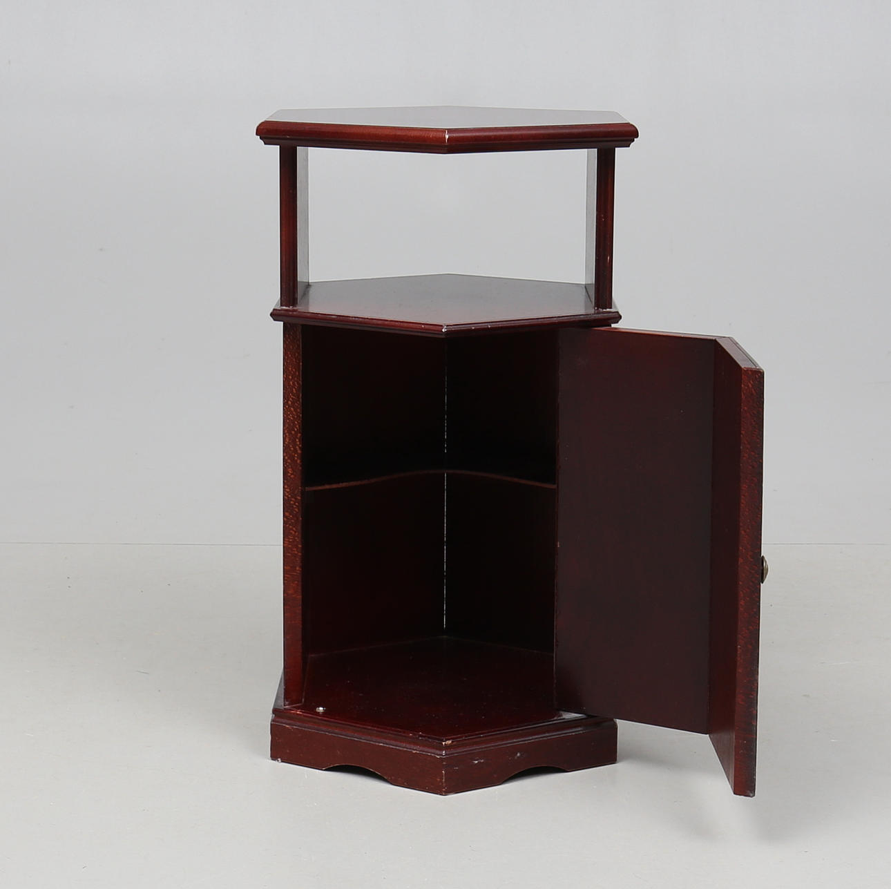 Fineret med mahogni. En låge med hylder bagved. Diameter 38. Højde 66 cm.