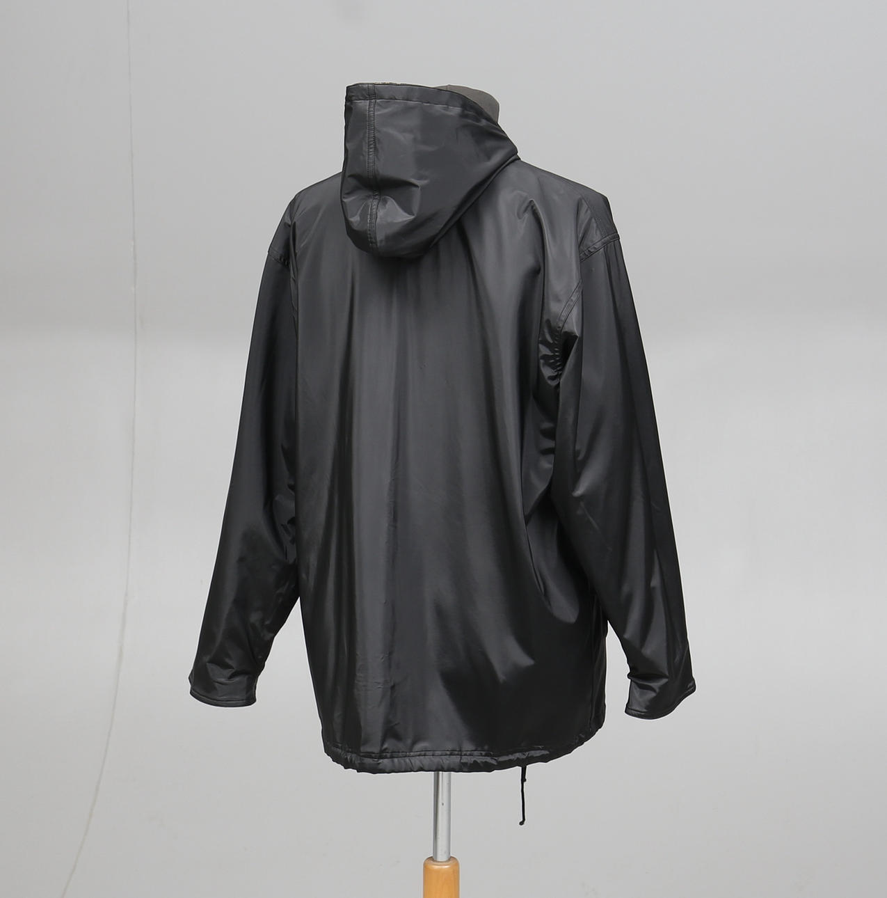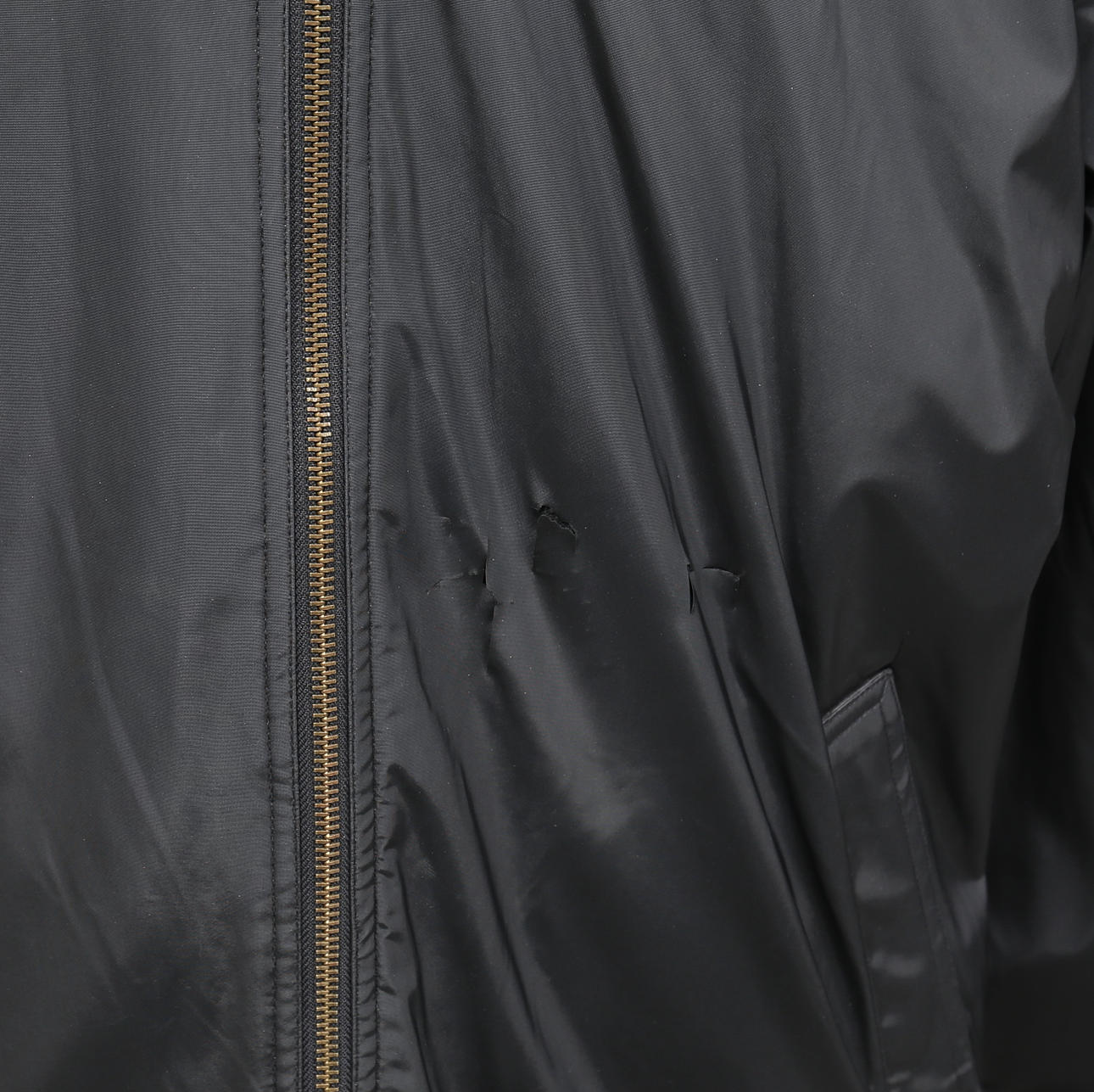 Brugsslitage. Lås på lynlåsen mangler. Den sorte side med revner i stoffet.