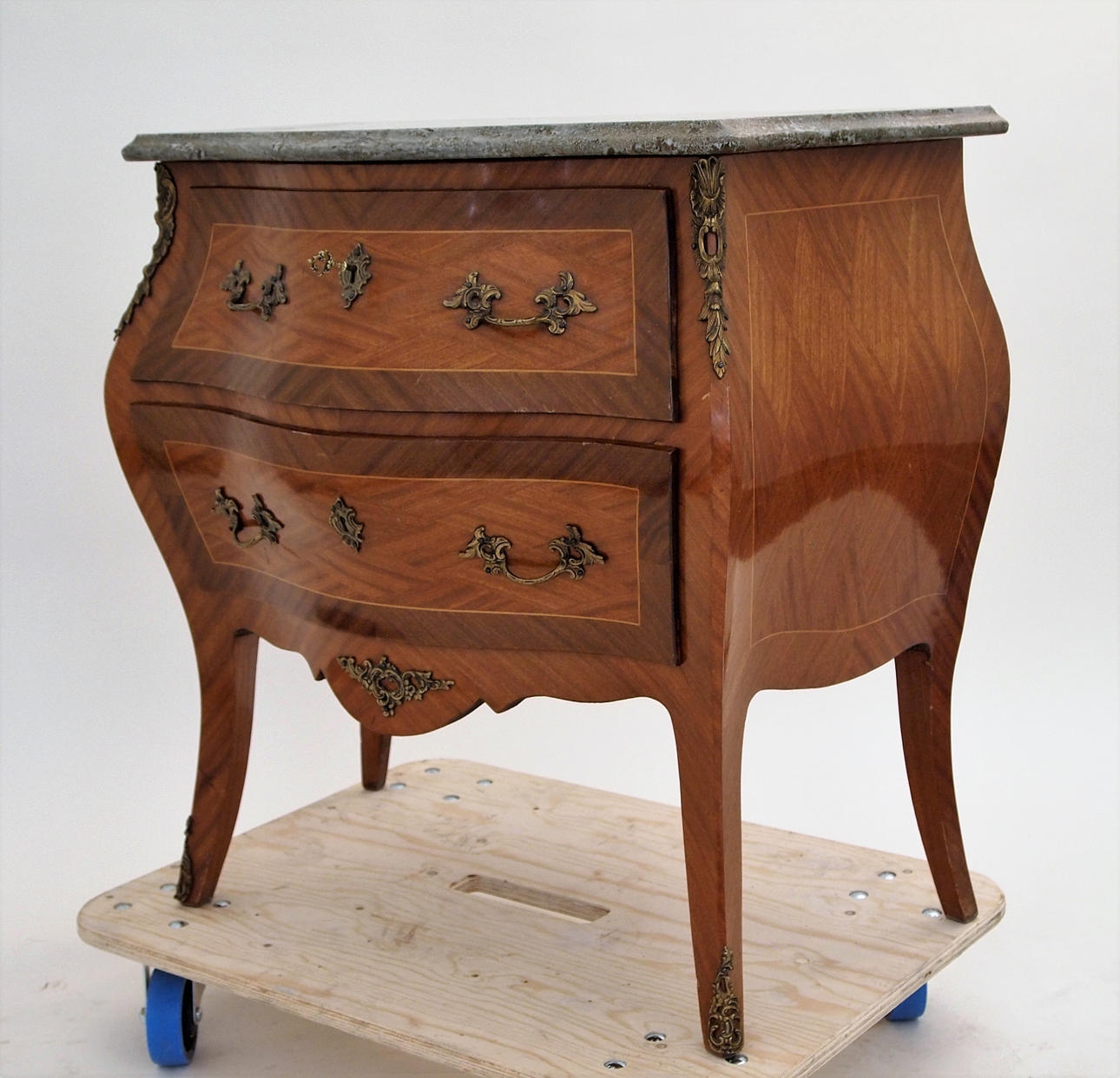 Stilfuld kommode med stentop og to skuffer, nøgle medfølger Mål med top, højde 77 cm, bredde ca 78,5 cm, dybde 42 cm.