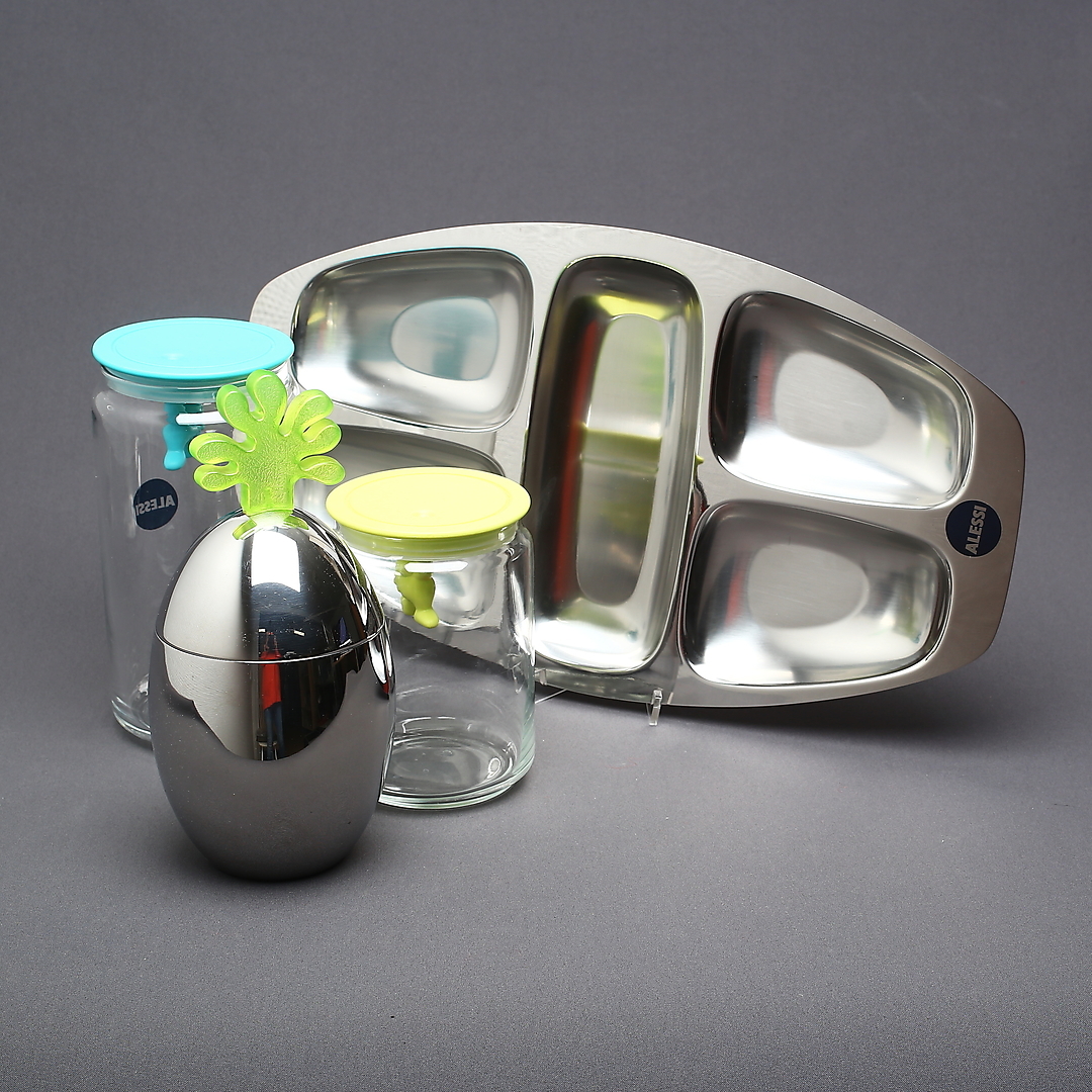 802230. ALESSI, 4 dele, krukker, tapasfad og isspand.