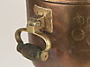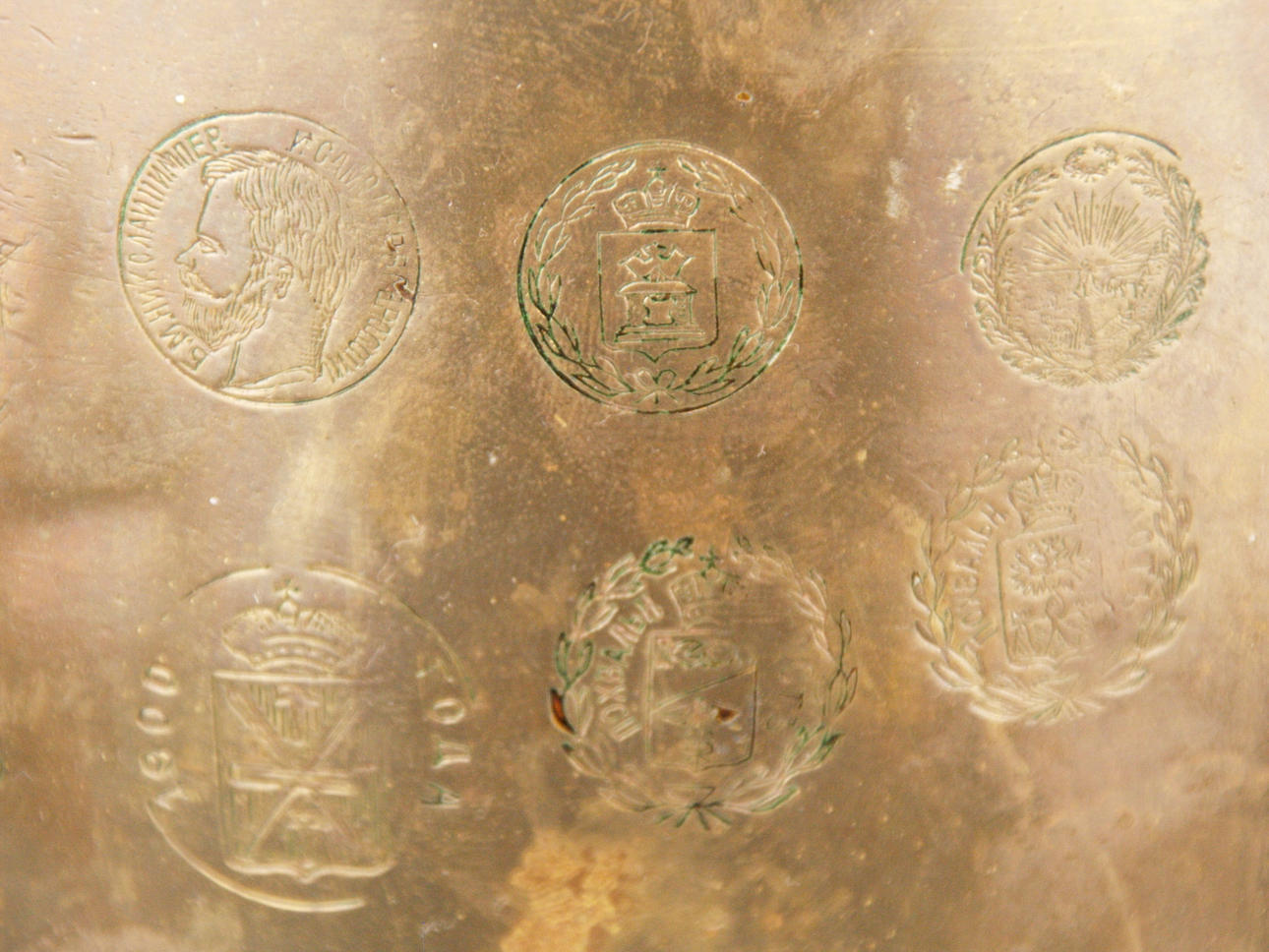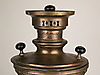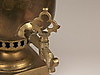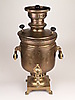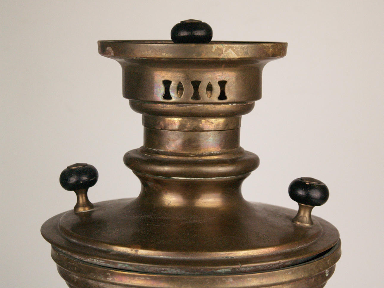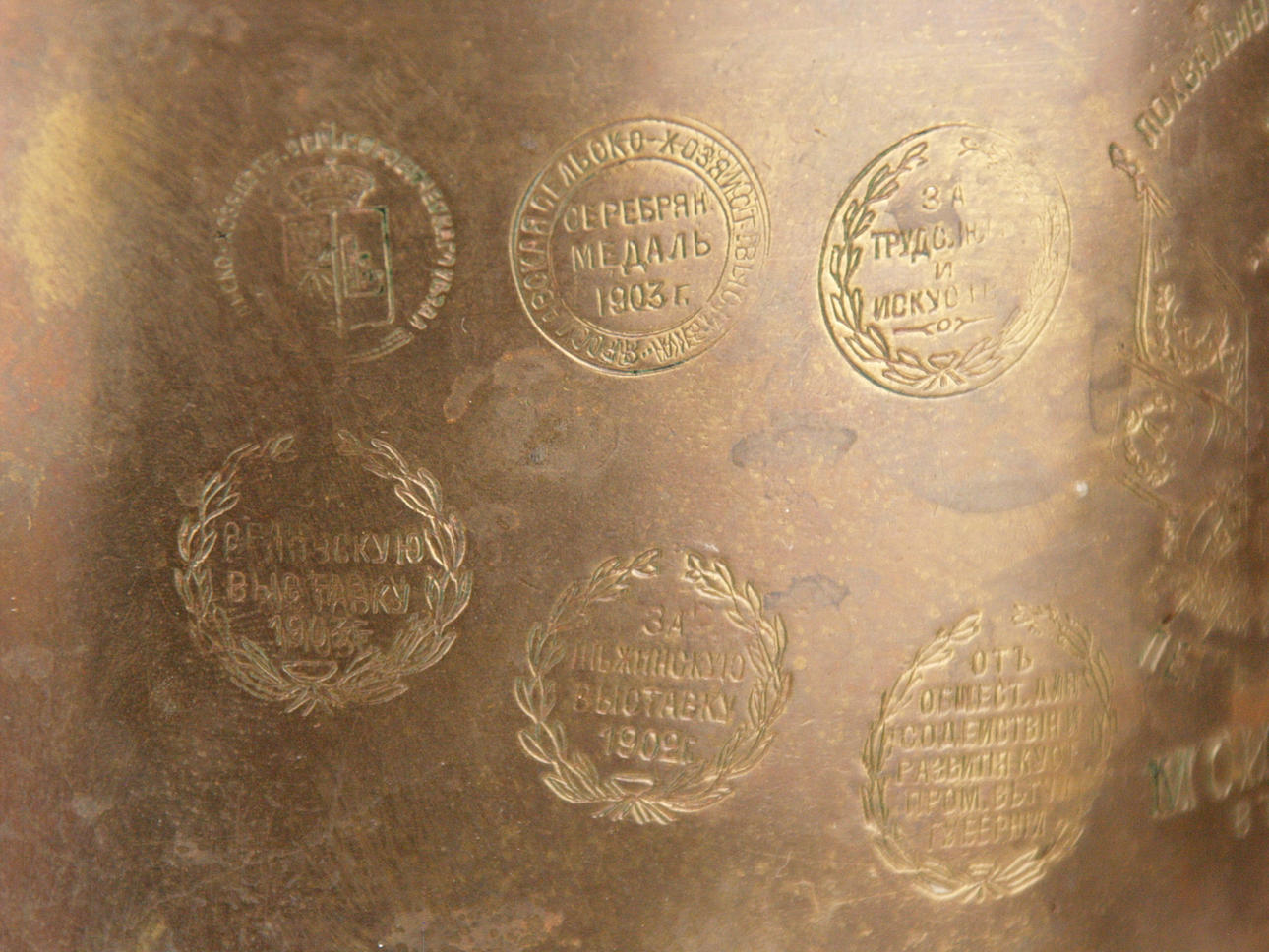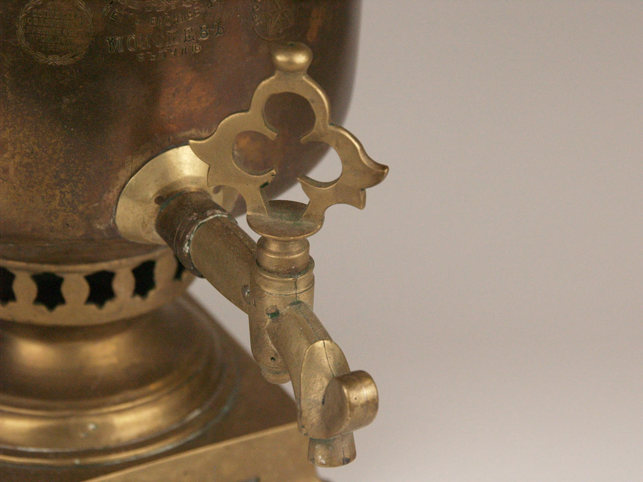 Russisk samovar - Rusland, Tula, Moiseev firmamærke, omkring 1900, messing, front med diverse kendetegn, medaljer og ærespriser fra 1900-03, firkantet stativ, cylindrisk krop, 2 håndtag, funktionel, brugsspor, H.ca. 47 cm.