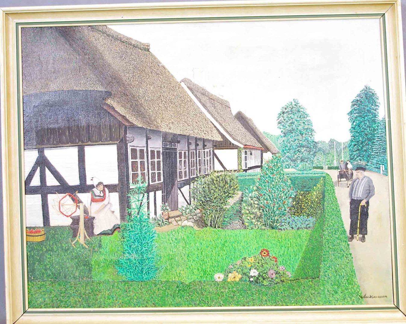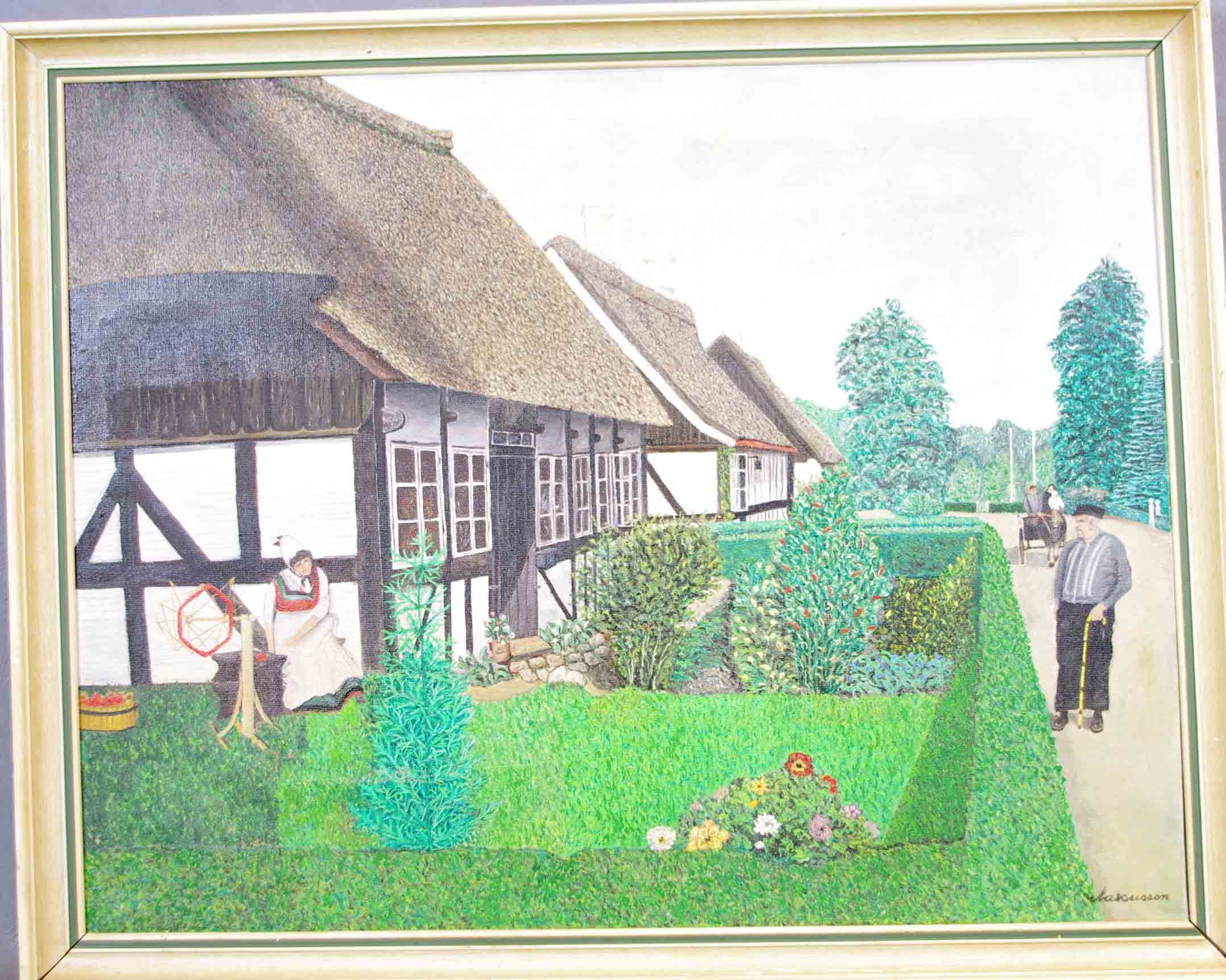 81284. OKÄND KONSTNÄR. bindingsværkshuse, olie på lærred.