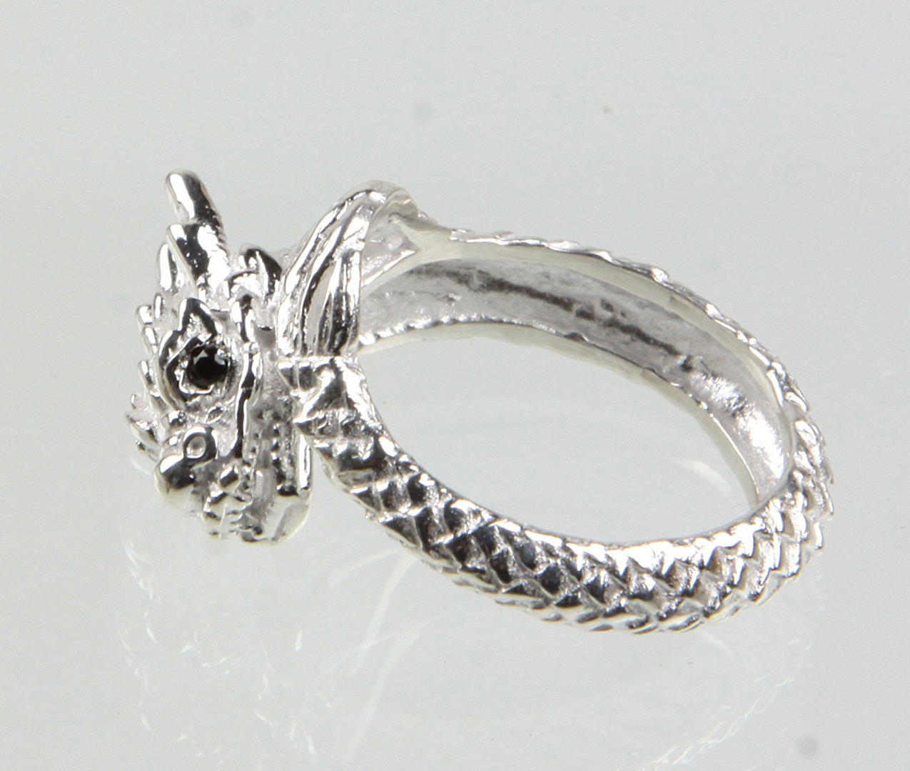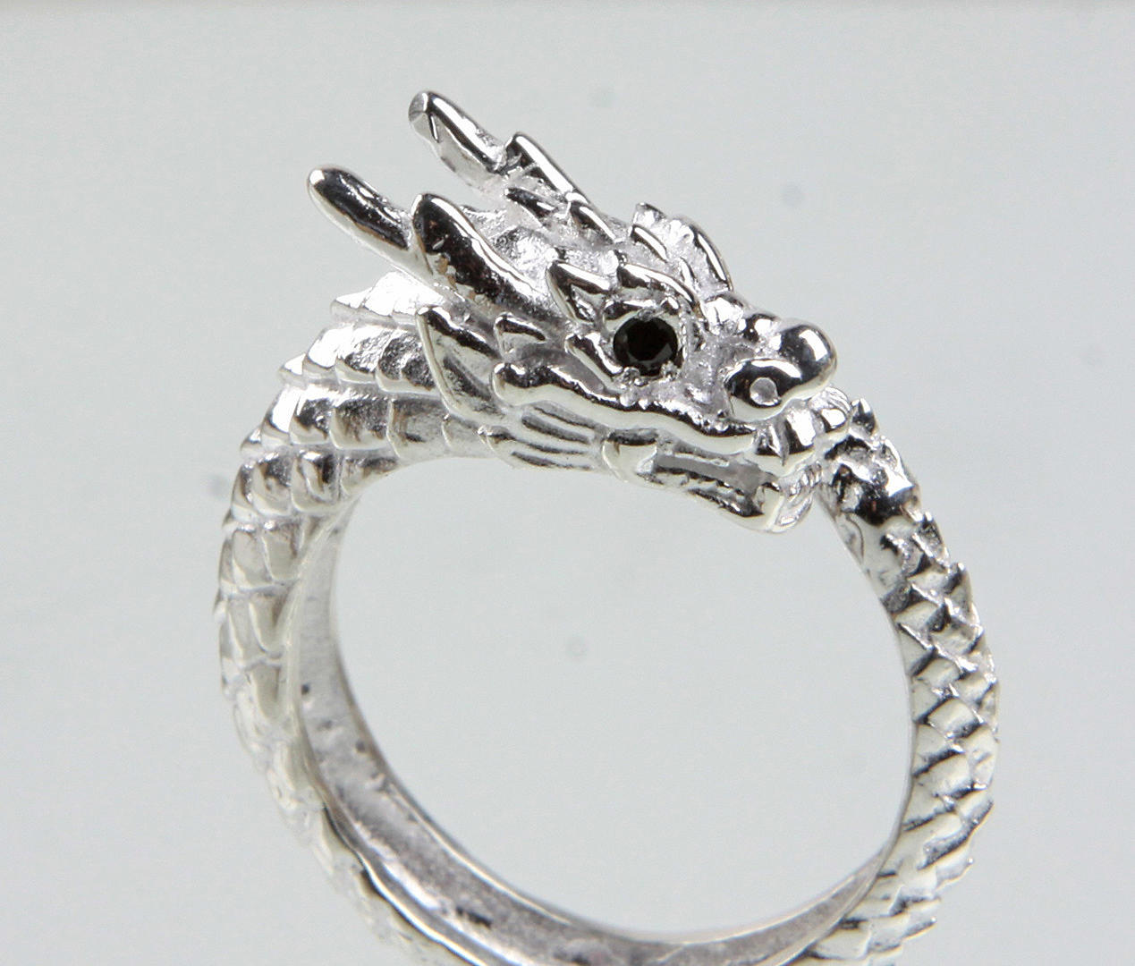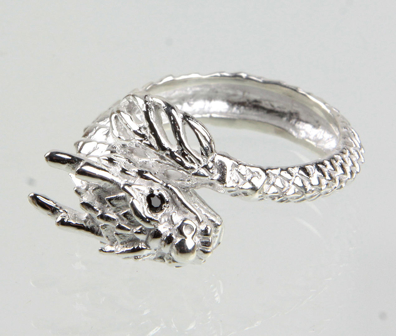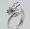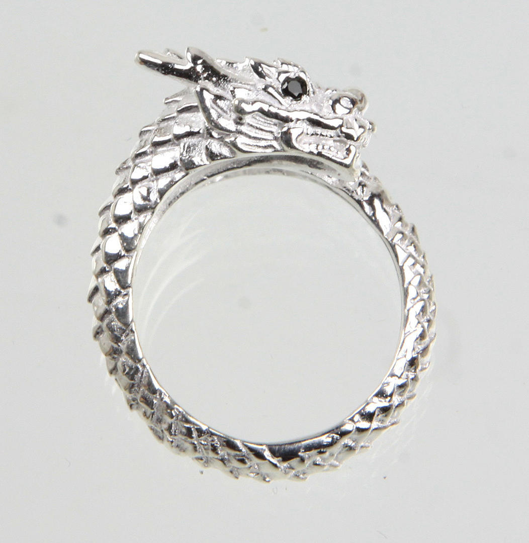 Drage - ring 925 sølv, i form af en drage, øjne af skåret onyx, ringstørrelse 59, ringhovedbredde 14 mm, vægt: ca. 7,8 gram.
