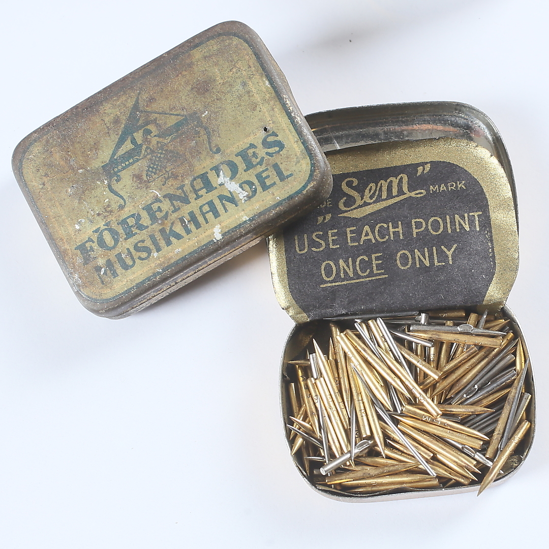 821487. Blikdåser, 7 stk, grammofonnåle.