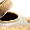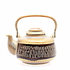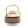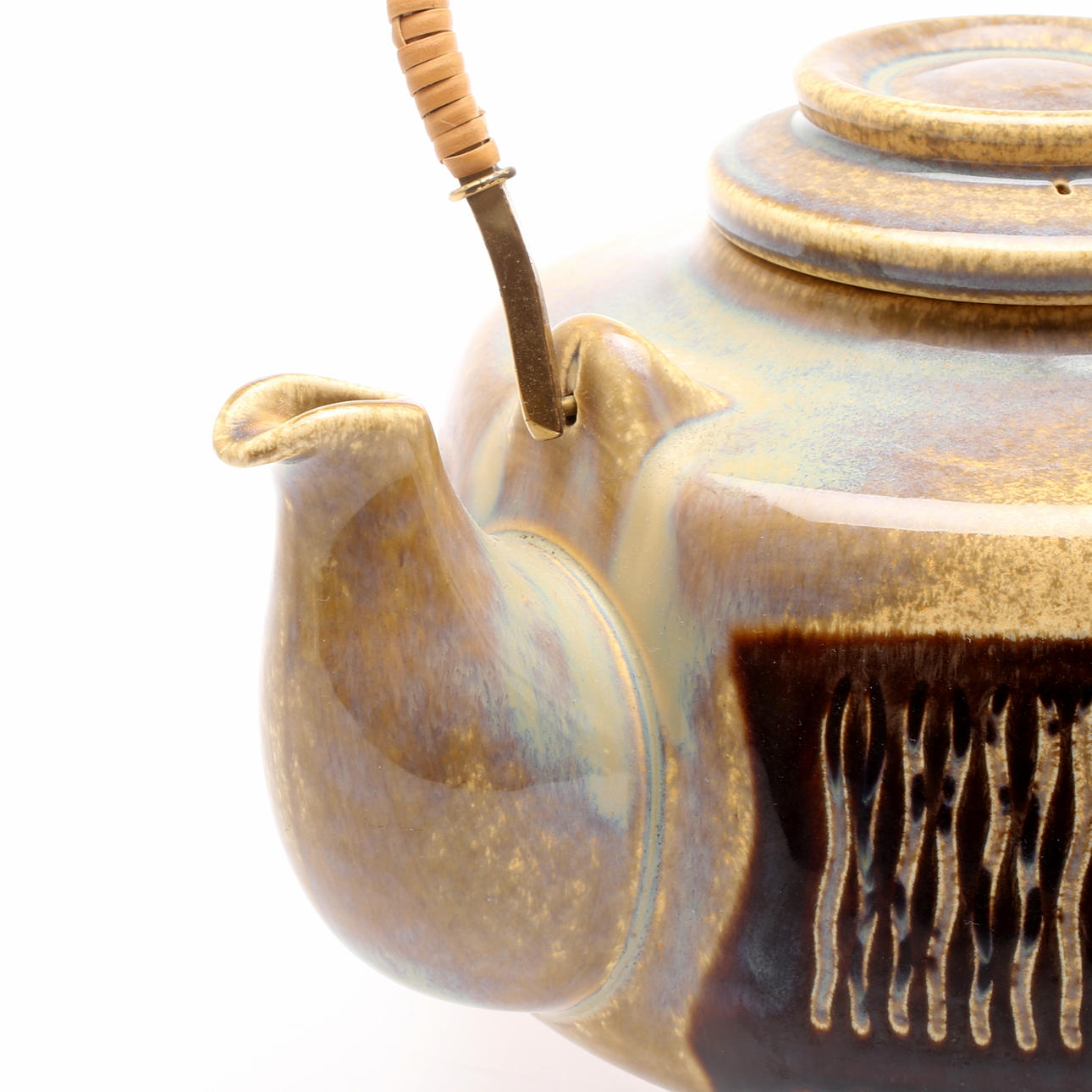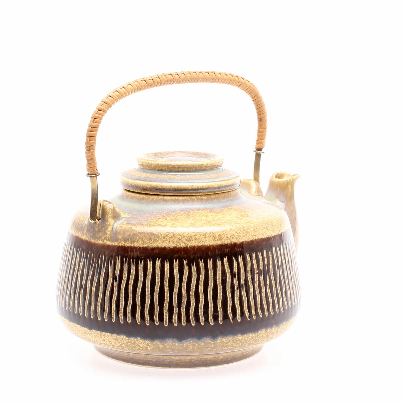 Glaseret med reliefdekor i brun. Håndtag i messing og rattan. Højde inkl. håndtag 21 cm.
