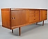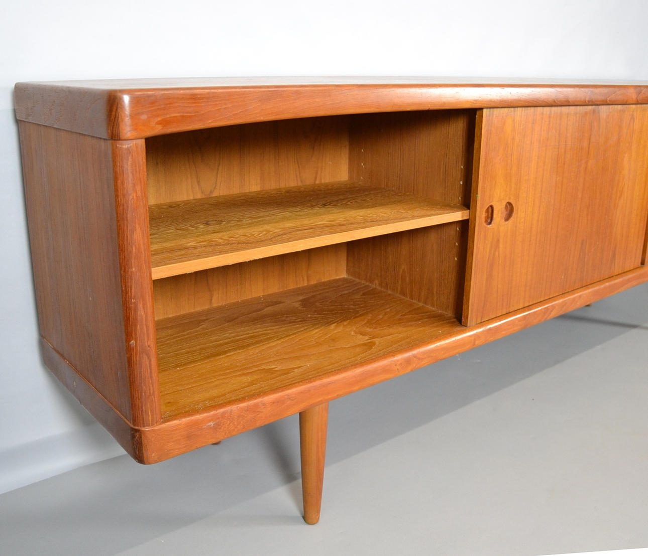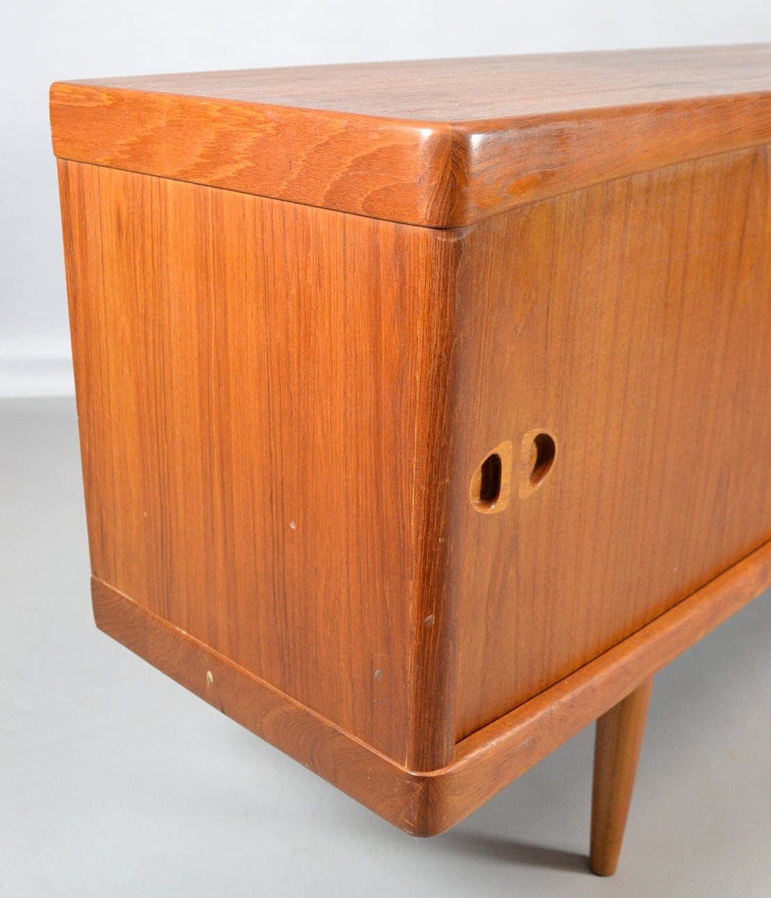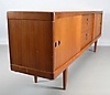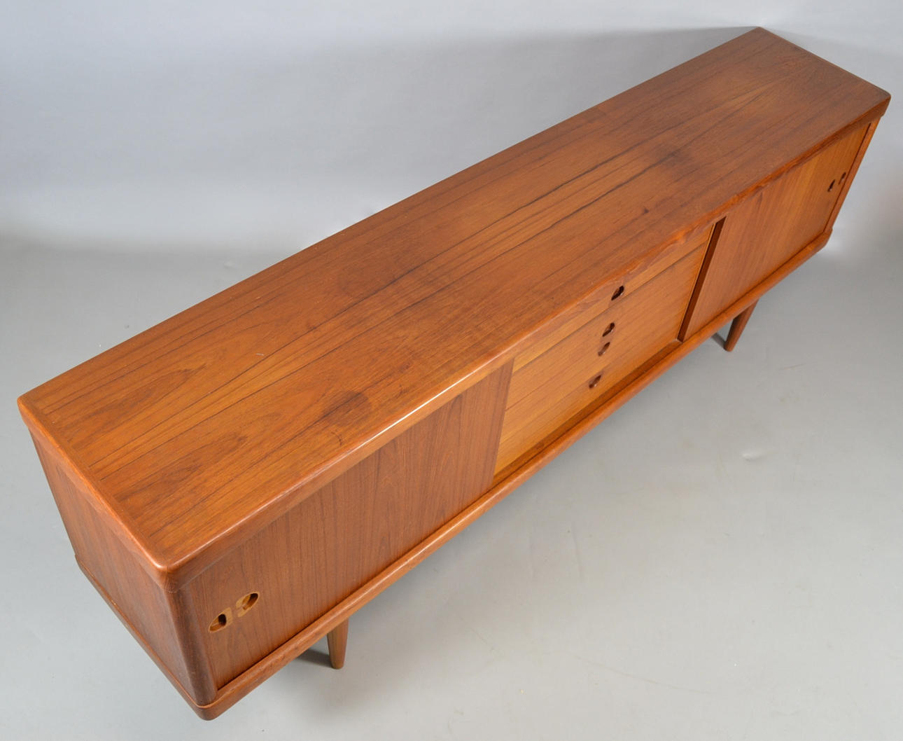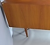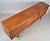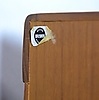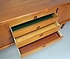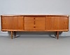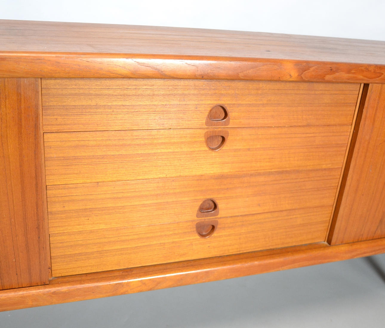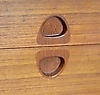 Teaktræ med skydelåger og skuffer.