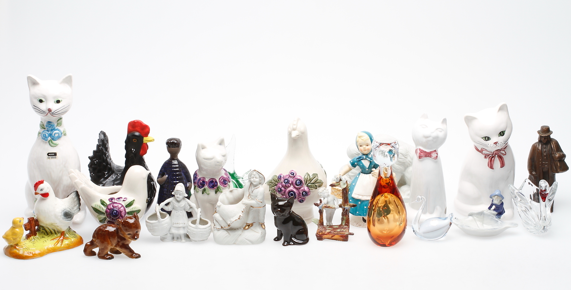 82539. FIGURER, ca. 20 stk., metal, keramik og glas.
