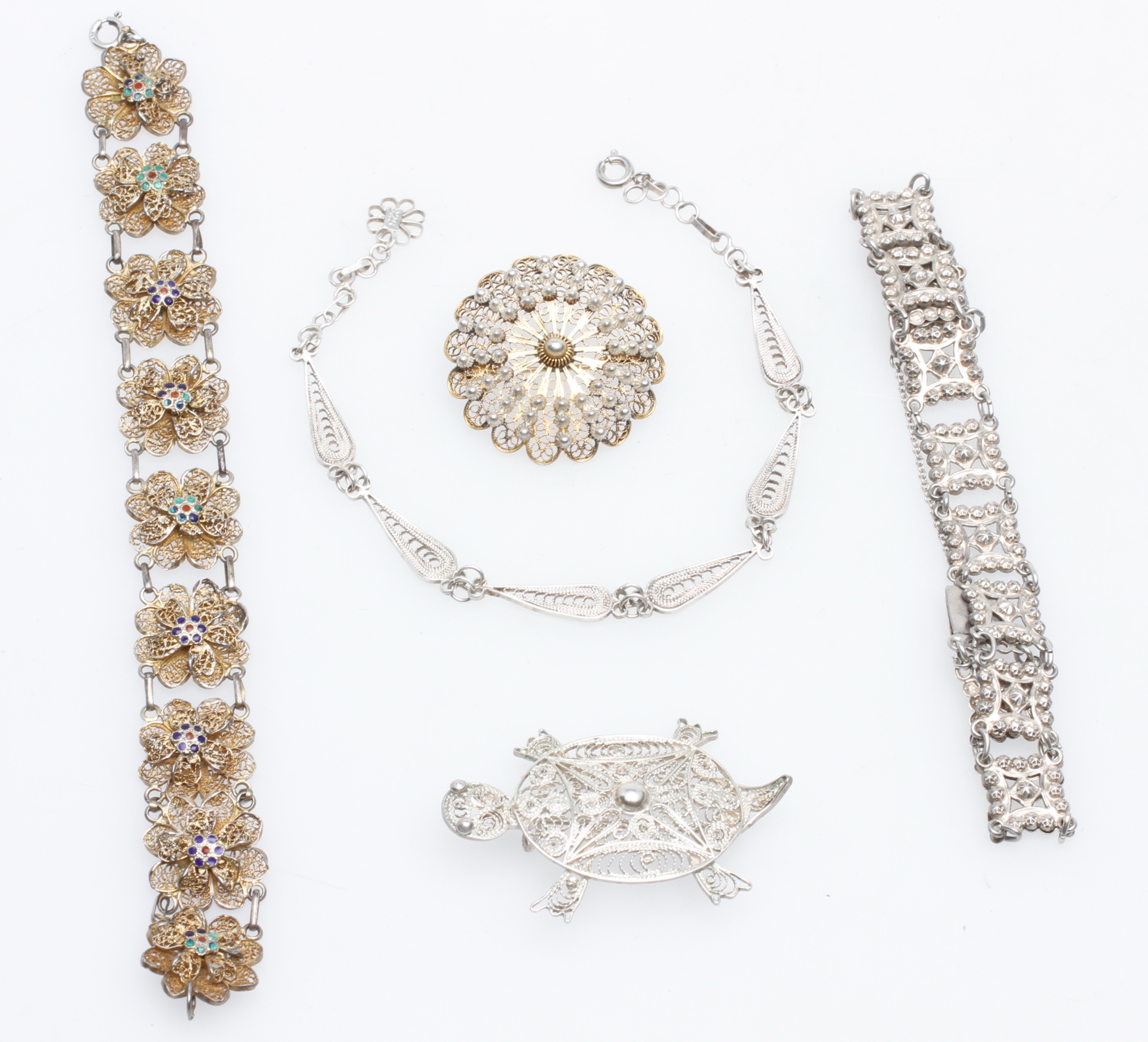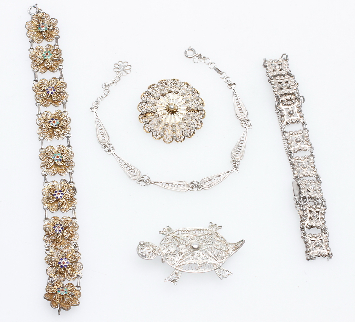 83758. SMYKKER, 5 dele, sølv bl.a. filigran.