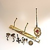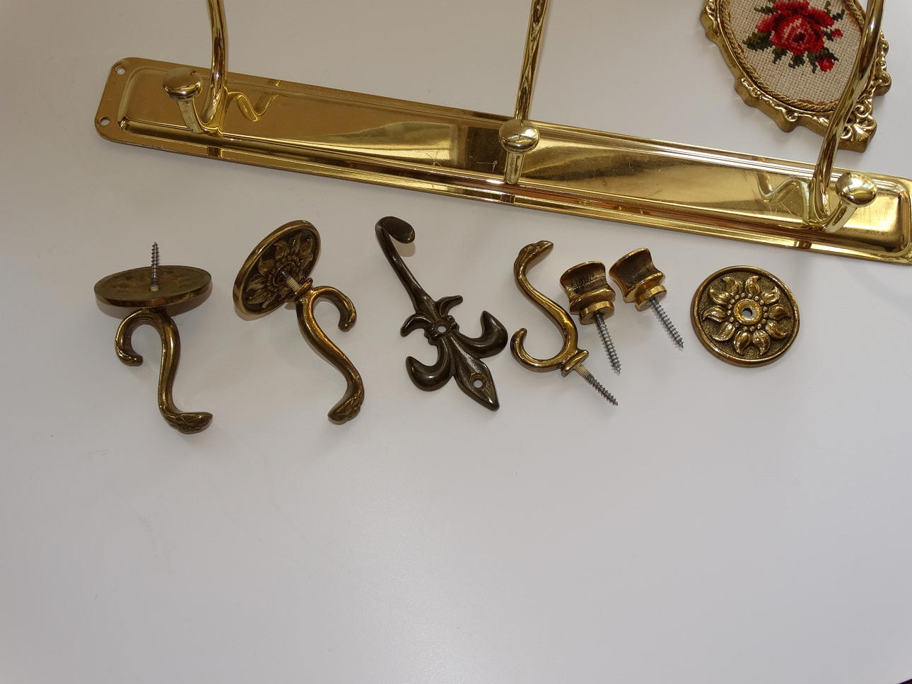 Forskellige knage i messing, ca. 8 x 5 cm, knapper, ca. 16 x 8 cm, med broderi, ca. 40 x 5 x 14 cm, knager.