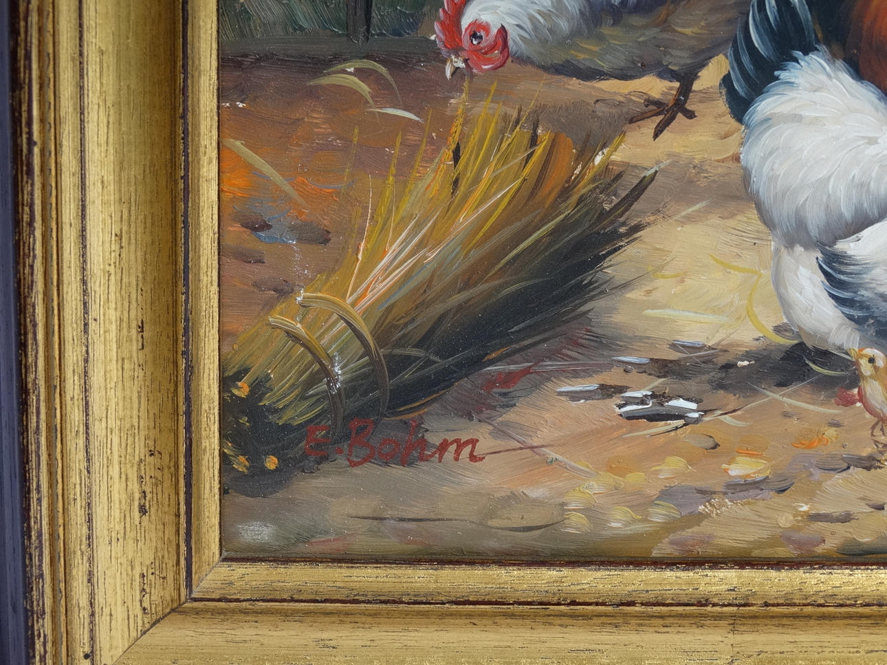 Oliemaleri: motiv fjerkræ, ca. 24 x 19 cm, indrammet ca. 31 x 25 cm, signeret E. Bohm, ca. 1950.