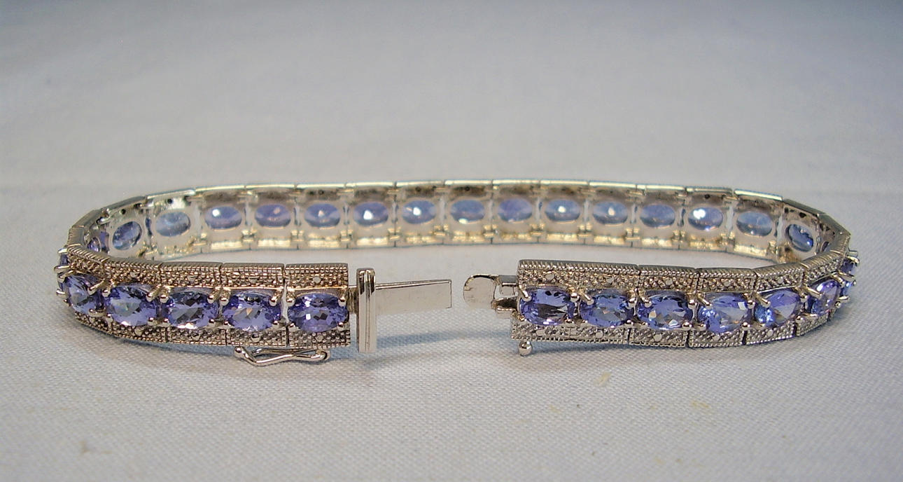 Armbåndet er lavet af 925 sølv og stemplet. Det er designet som et Riviere-armbånd og sat med 30 ovale facetslebne, naturlige tanzanitter af smuk farve og kvalitet. Tanzaniterne er individuelt sat med kløer og er omkranset af brede strukturerede bånd til højre og venstre. Hver tanzanite er forbundet med den næste med en bevægelig fatning, hvilket resulterer i en meget god mobilitet og en høj bærekomfort.