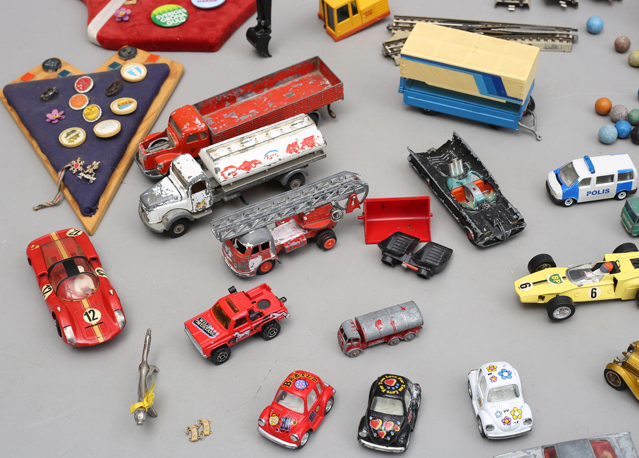 922115. LEGETØJSBILER, MÆRKER, NÅL, KUGLER, SPIL, 1900-tallet.