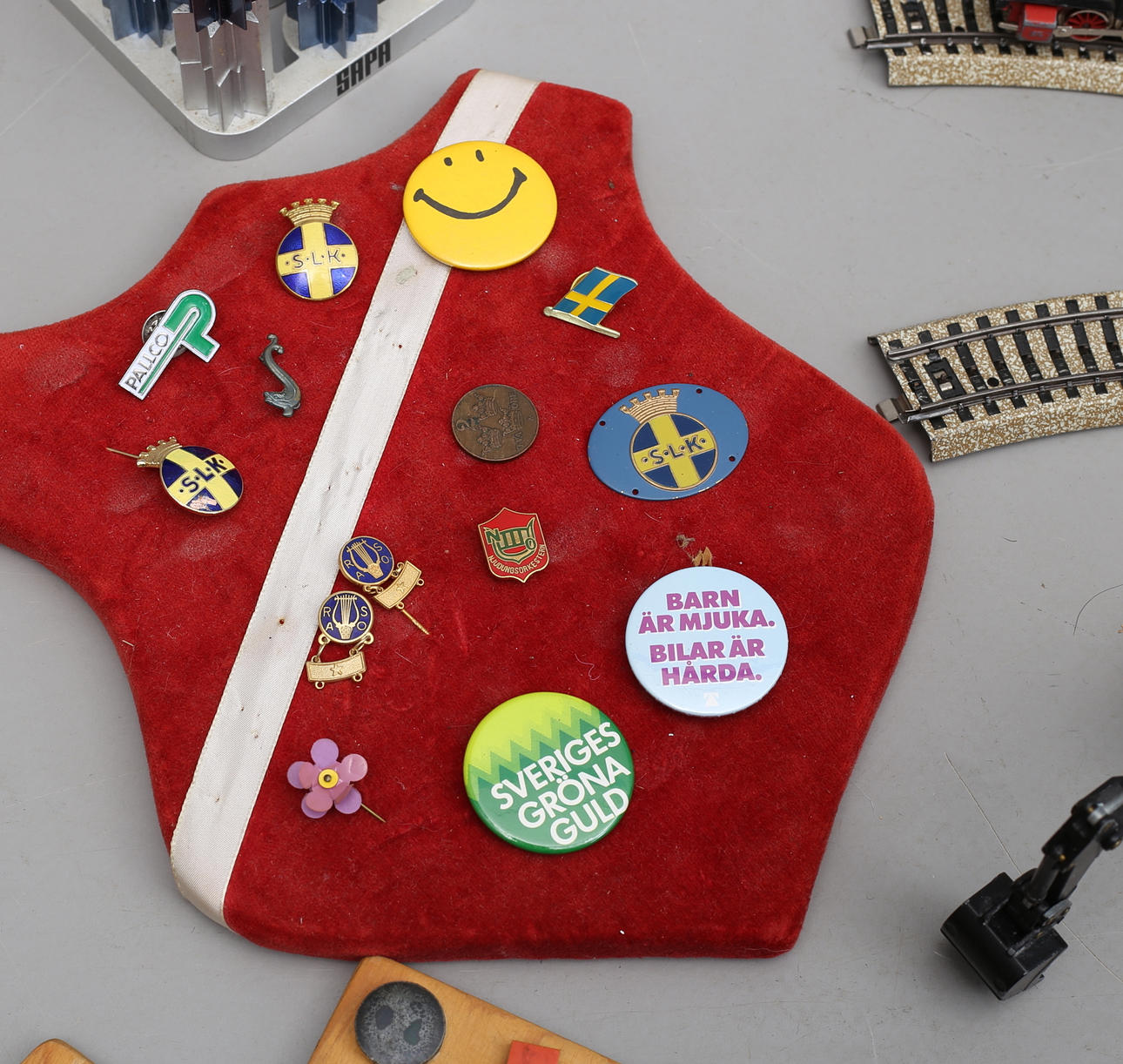 Kugler, nåle og badges.