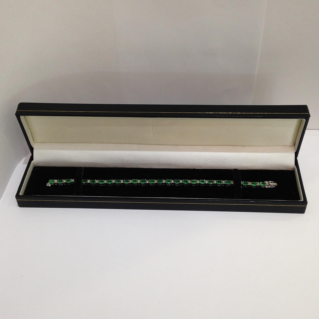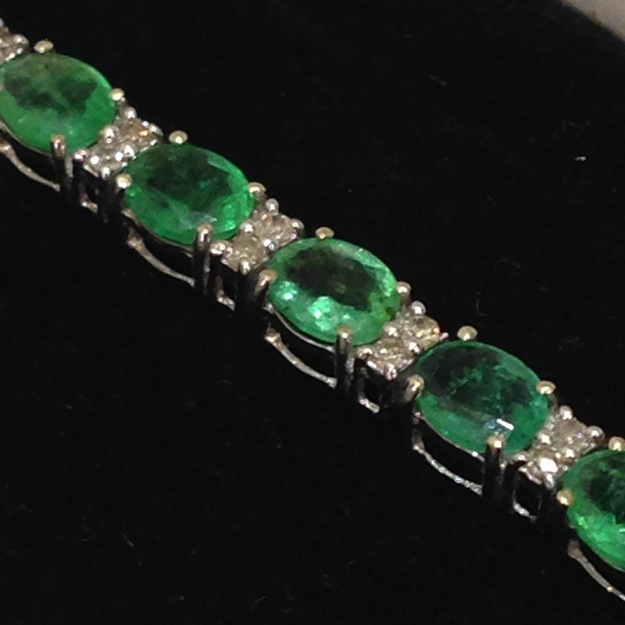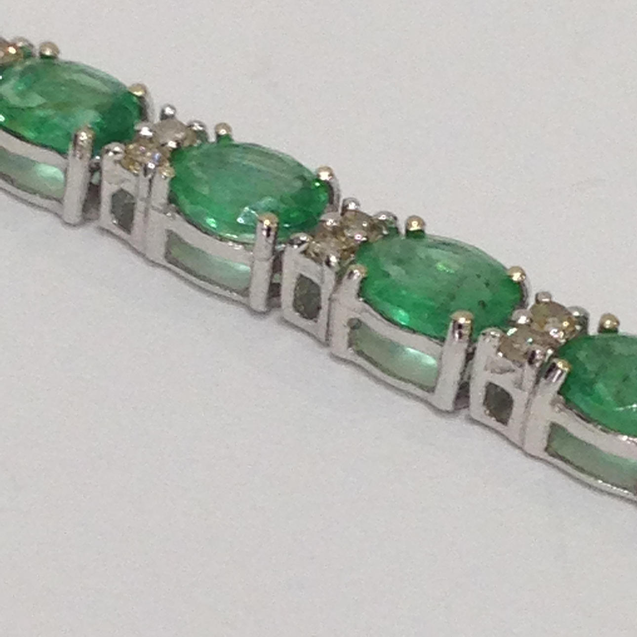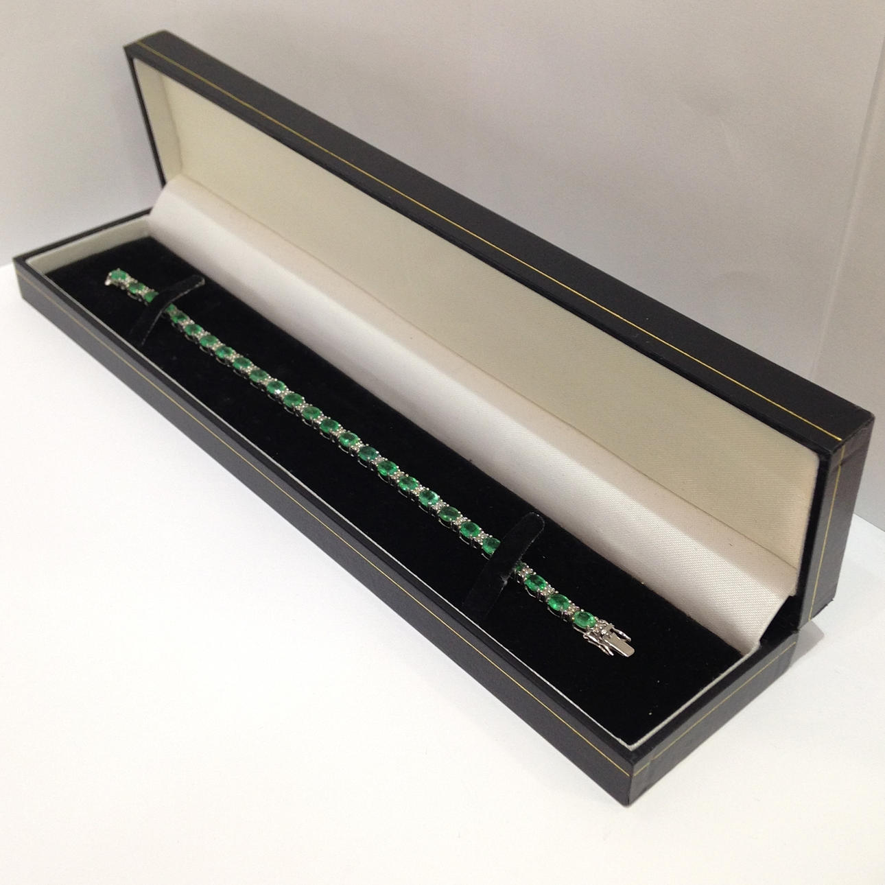 18 karat hvidguld smaragd og DIAMANT armbånd Dette armbånd er umærket, men testet som 18 karat hvidguld (stemplet "750") Dette armbånd kommer med sin egen præsentationsæske Dette armbånd er sat med 26 smaragder og 52 diamanter Stenene er sat i 4 klobeslag Armbåndets længde er cirka 7,5 tommer. Dette armbånd har en åben bokslås med sikkerhedshåndtag. Omtrentlig DIAMANT = 0,57 carat Omtrentlig smaragdvægt = 9,80 carat Armbåndsvægt = 8,5 gram Æskevægt = 109,6 gram Totalvægt = 118,1 gram.