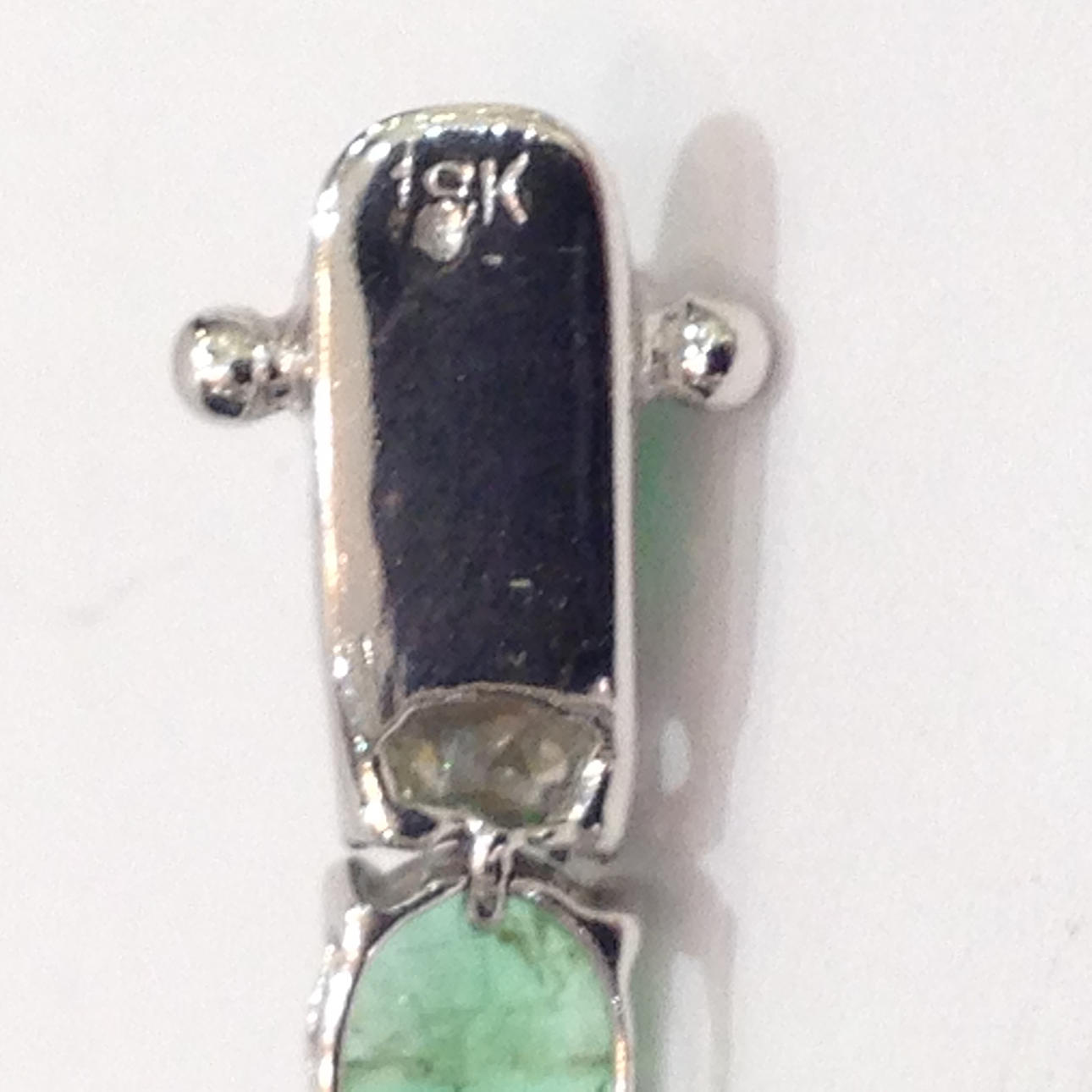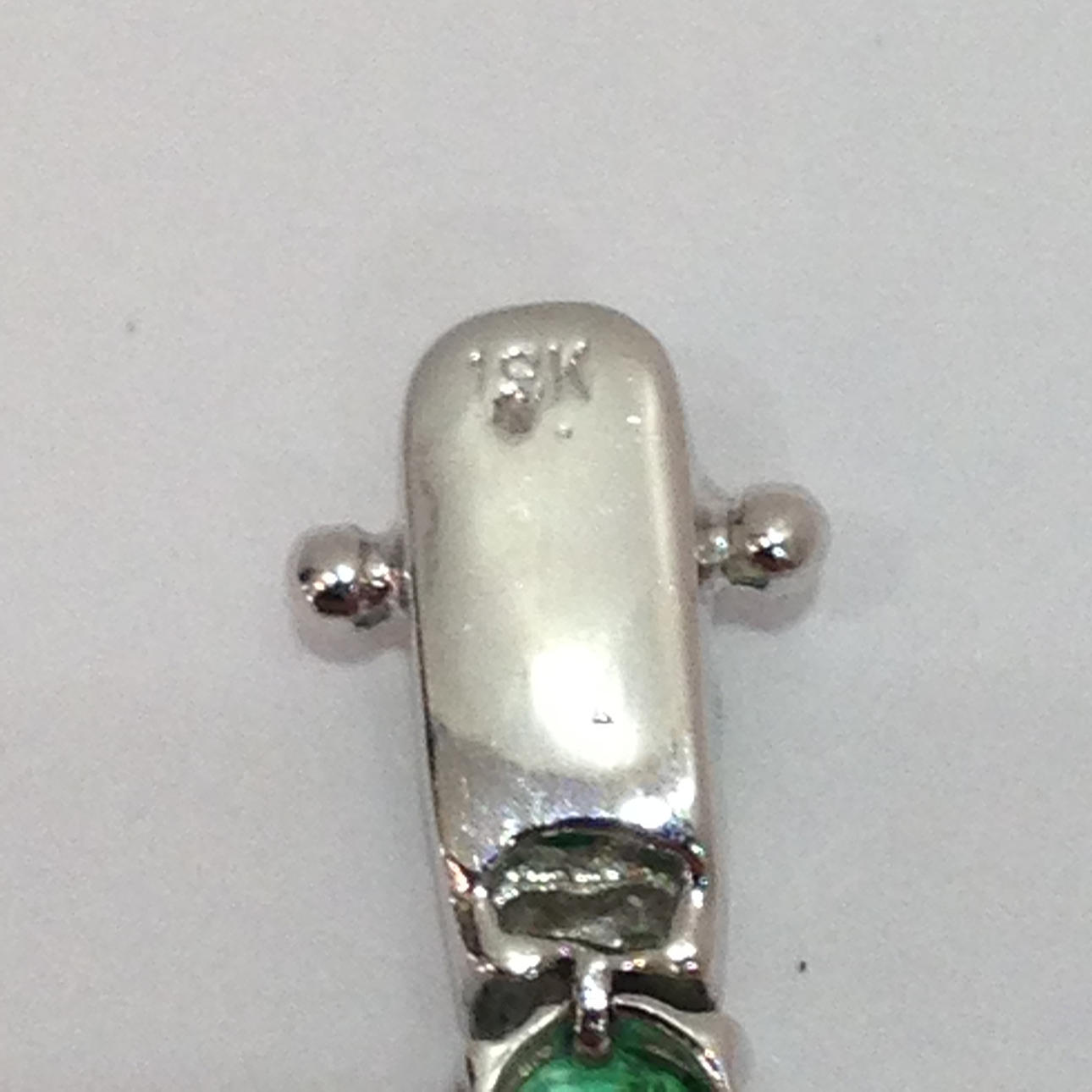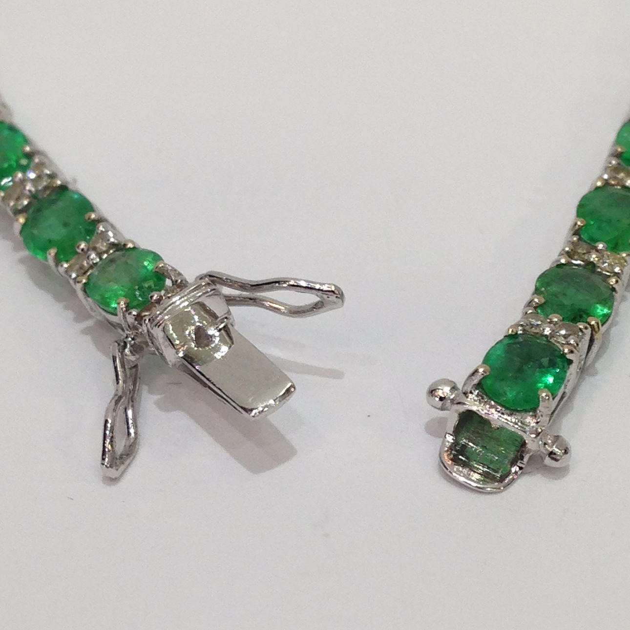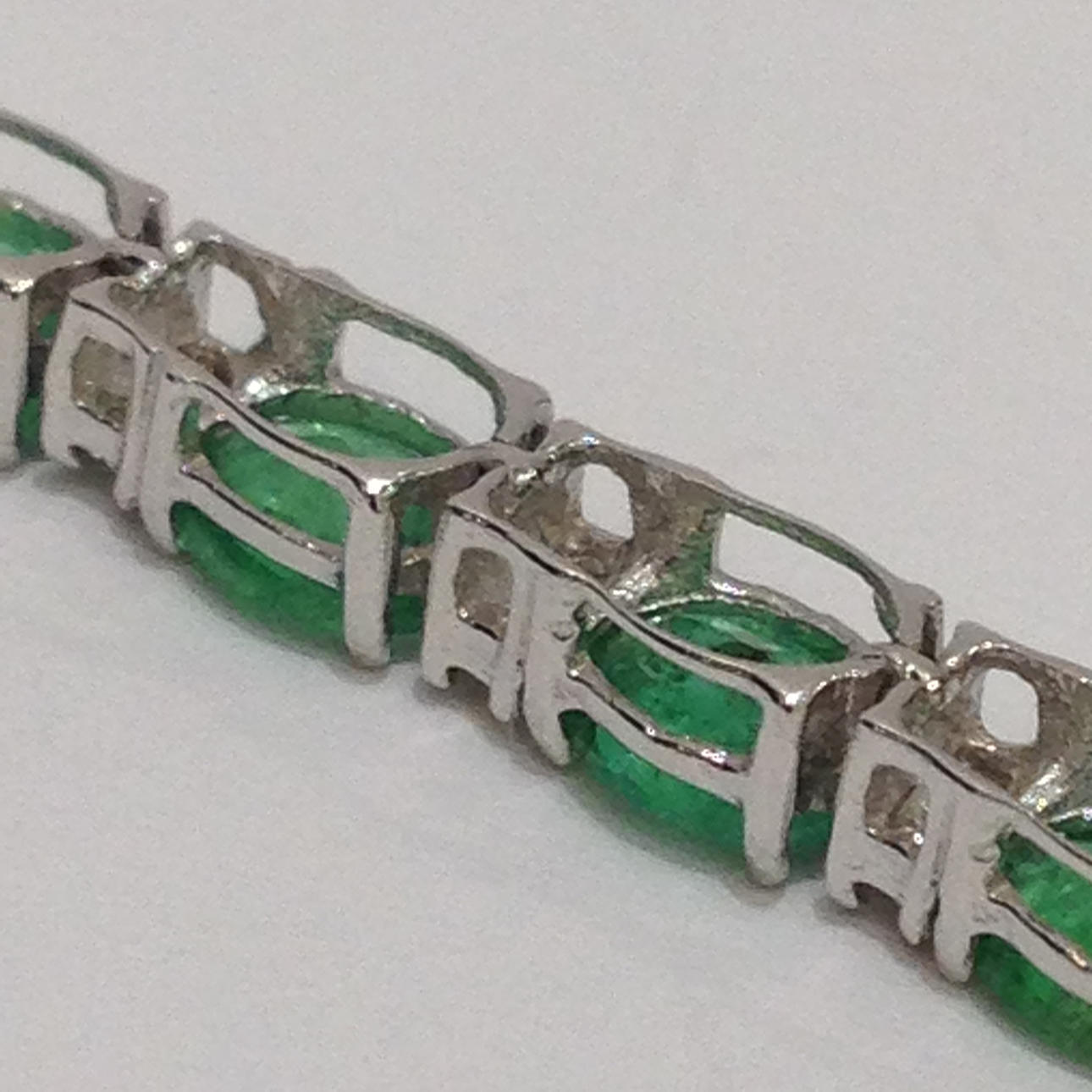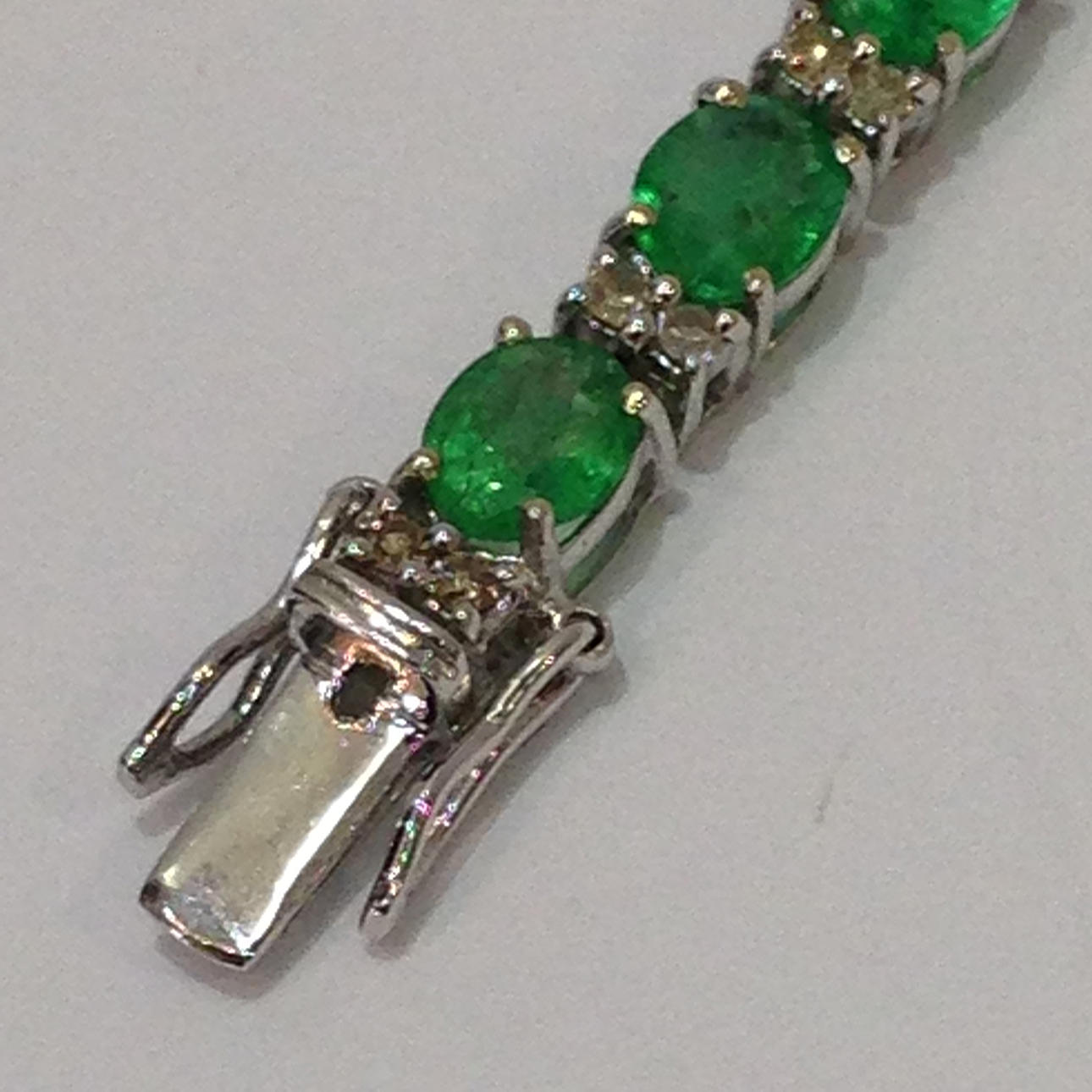 18 karat hvidguld smaragd og DIAMANT armbånd Dette armbånd er umærket, men testet som 18 karat hvidguld (stemplet "750") Dette armbånd kommer med sin egen præsentationsæske Dette armbånd er sat med 26 smaragder og 52 diamanter Stenene er sat i 4 klobeslag Armbåndets længde er cirka 7,5 tommer. Dette armbånd har en åben bokslås med sikkerhedshåndtag. Omtrentlig DIAMANT = 0,57 carat Omtrentlig smaragdvægt = 9,80 carat Armbåndsvægt = 8,5 gram Æskevægt = 109,6 gram Totalvægt = 118,1 gram.