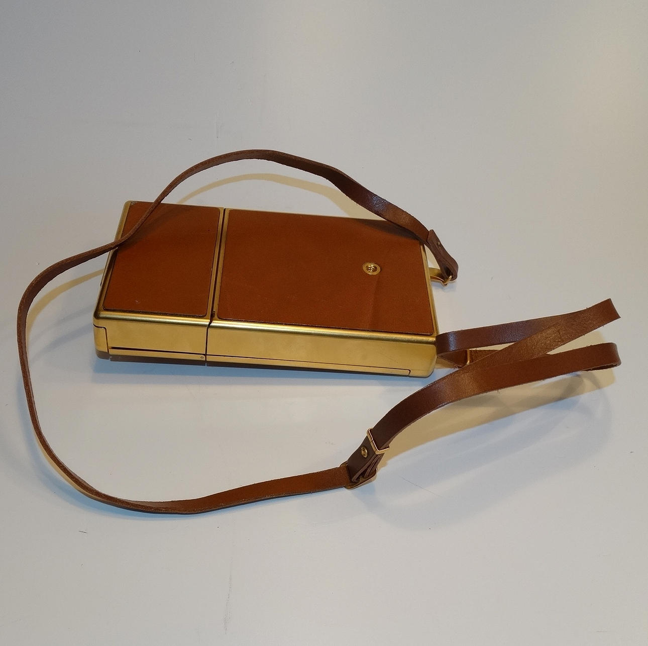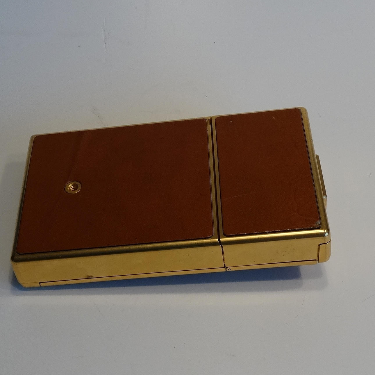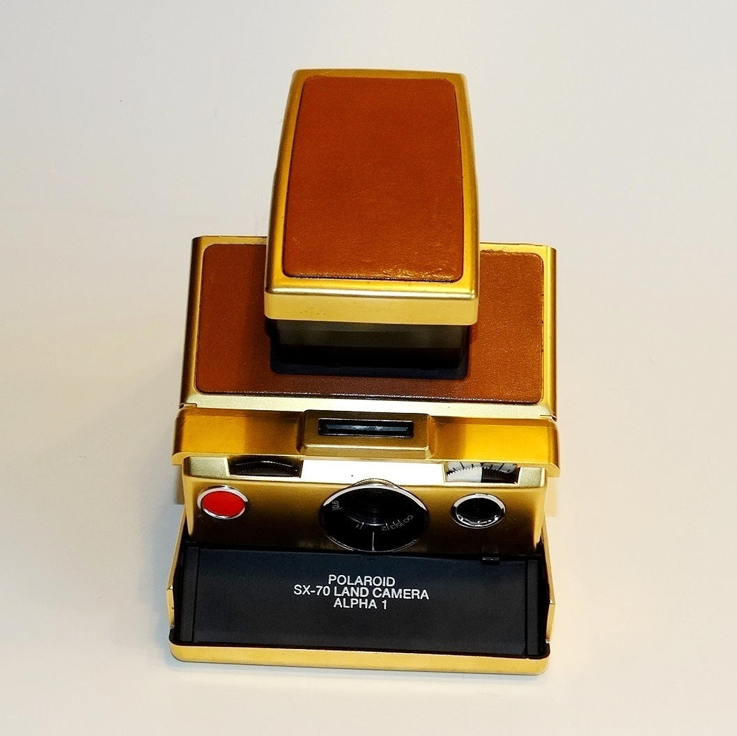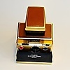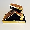 Polaroid SX 70 kamera lædercover med 24 karat guldbelægning, med montering, ca. 17,5 x 10 cm, vintage.