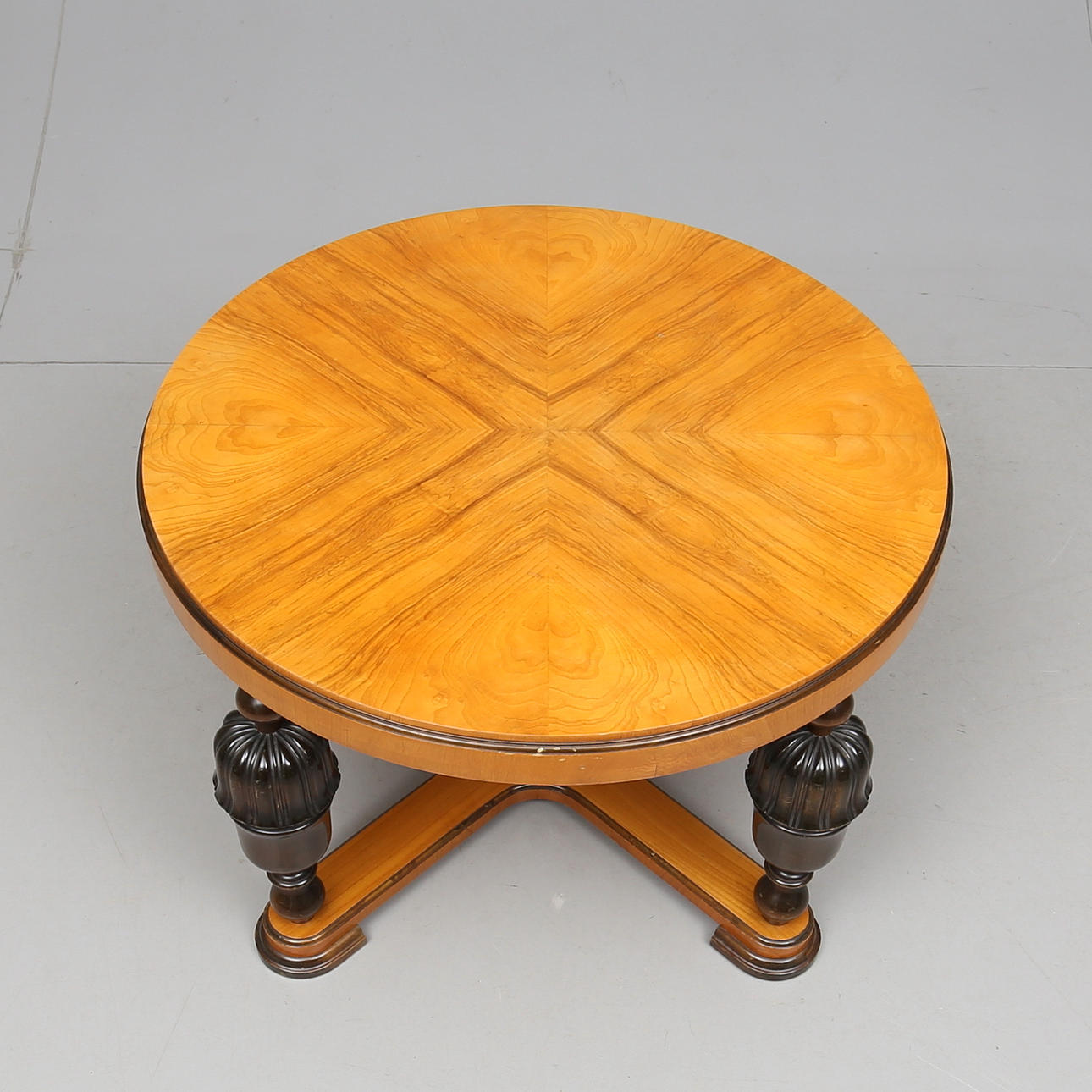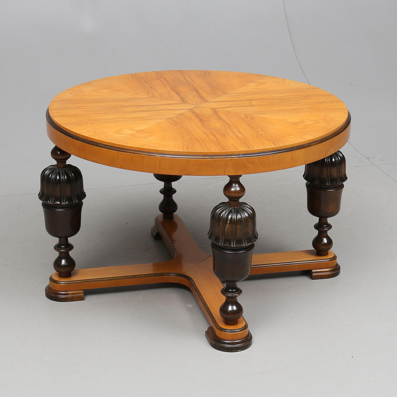 Fineret med blandt andet valnød og birk. Udskåret indretning. Koblet benstilling. Diameter 95. Højde 58 cm.