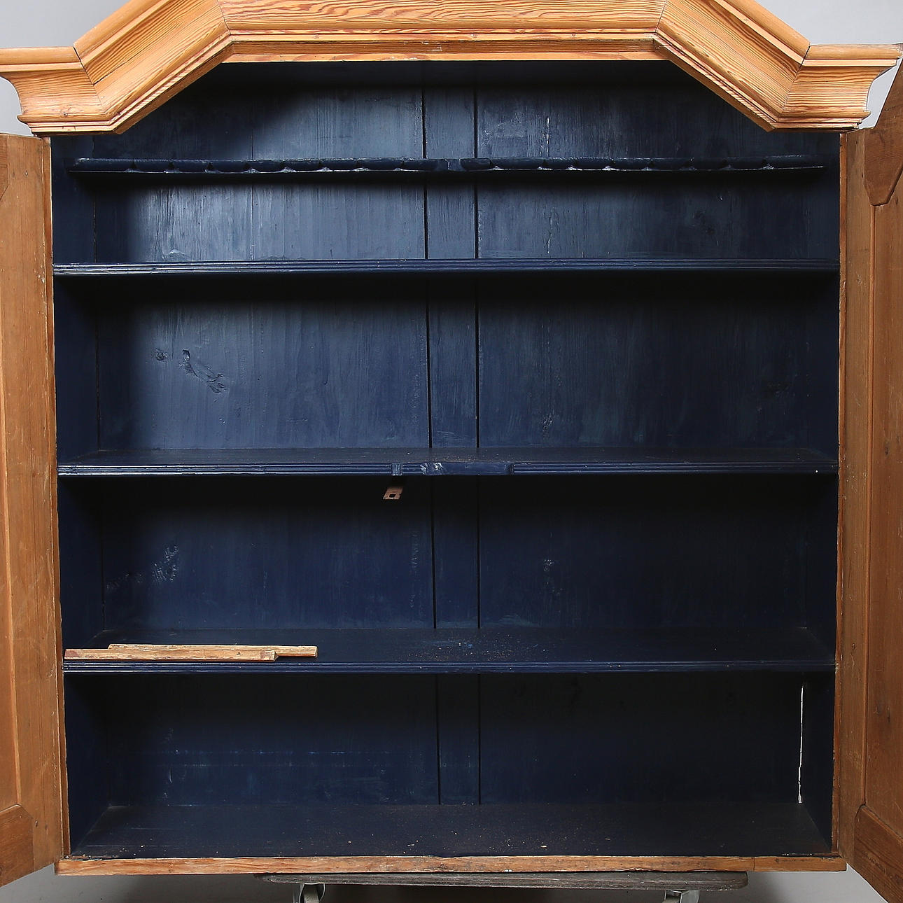 Overskab af fyrretræ med knækkede kronlister. To låger med underliggende hylder, hvoraf den ene er en skehylde. Blå malet indvendigt. Længde 140, bredde 40, højde 141 cm.