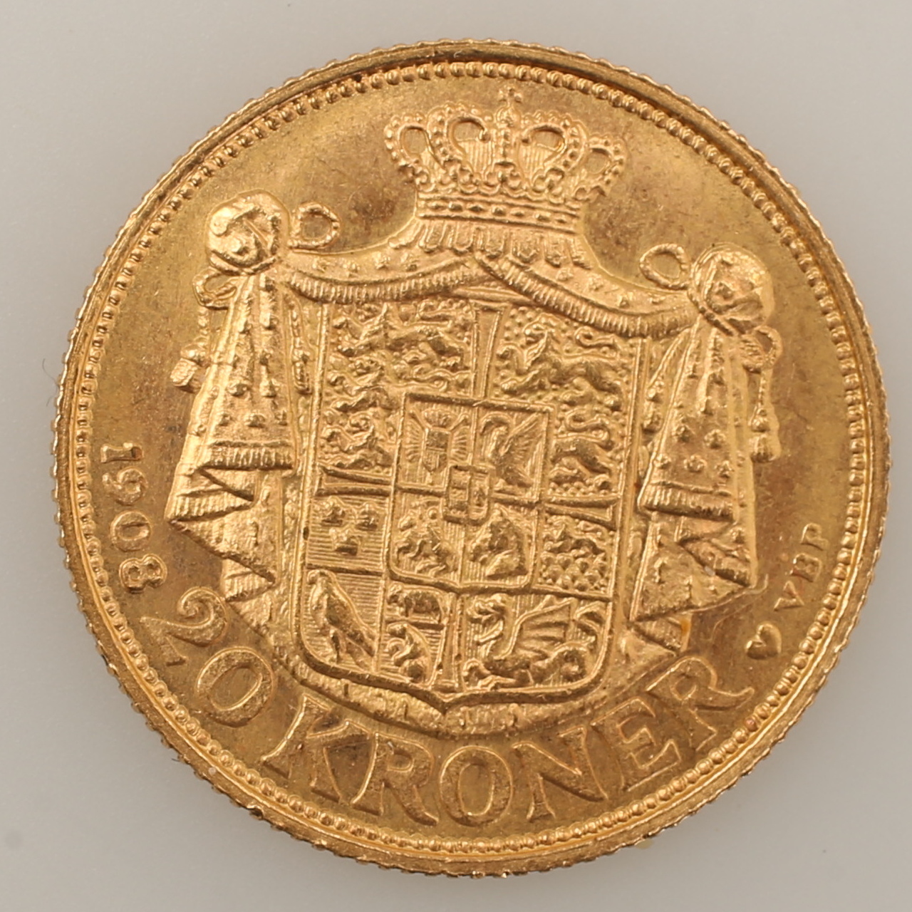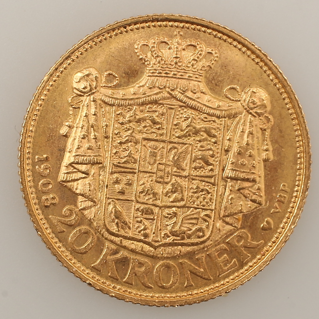 945123. GULD MØNT, 20 kroner, Frederik VIII, Danmark 1908.