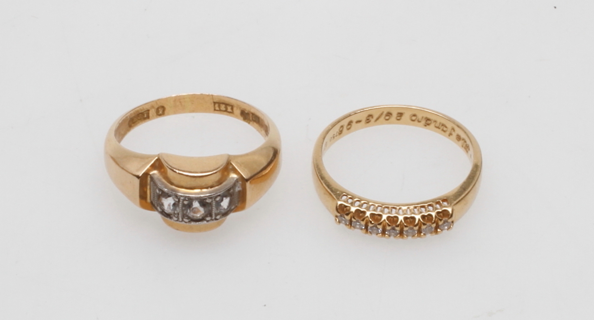 94654. RINGE, 2 stk, 18k guld, med sten, totalvægt ca. 5,8 gr.