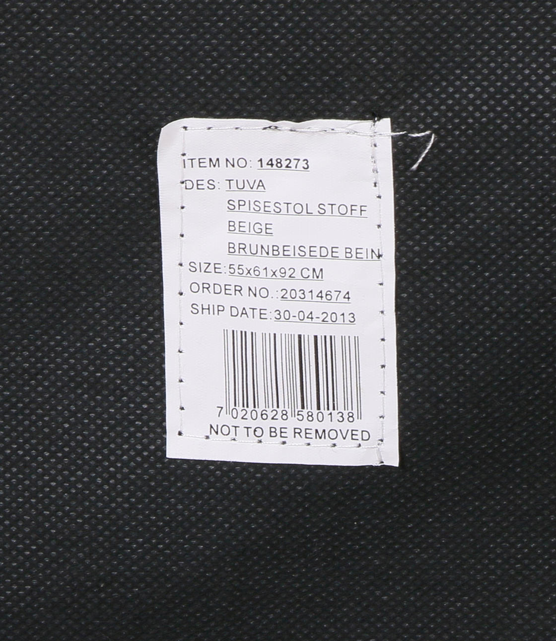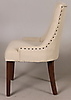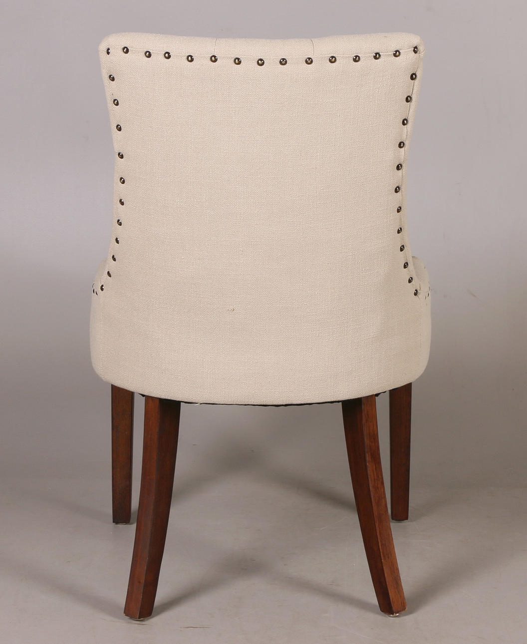 Stole i lys beige stof med polstret sæde, dekorativ søm og pikset ryg, hvidlakerede ben Ryglænshøjde 92, sædehøjde 48, sædedybde 43, bredde 54 cm.