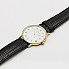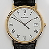 Kvarts. Etui i 18K guld. Lys urskive med romertal. Dato vindue. Diameter ca 33 mm. Originalt læder armbånd. I original æske.