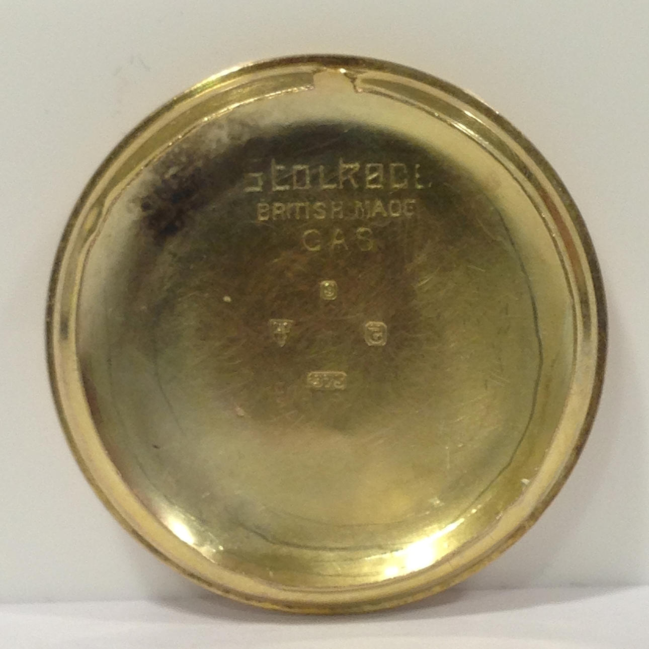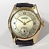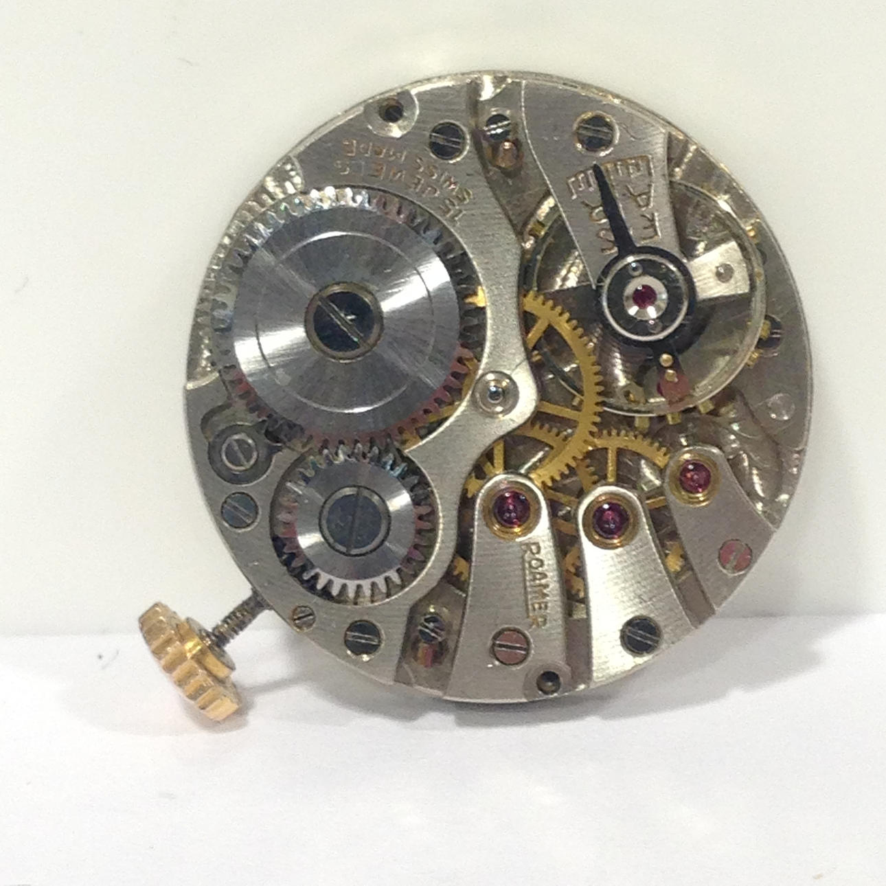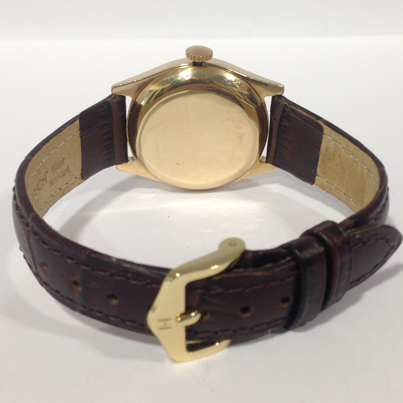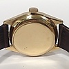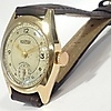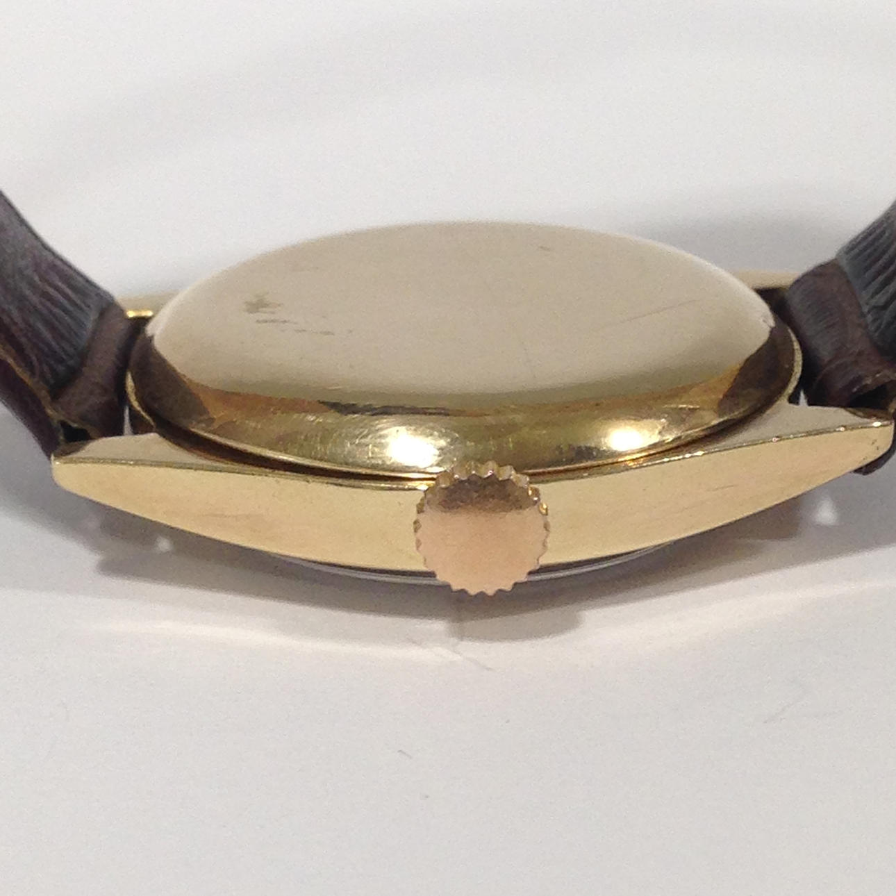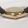 Et Roamer-ur i 9 karat guld CIRCA : 1940'erne - 50'erne FORM : Rund METAL : guld og stål urkasse DIAMETER : 28 mm BEVÆGELSESTYPE : mekanisk, håndvind JYVELER : 15 HÆNDER : feuilles stil rem : læder Totalvægt : 18g.