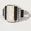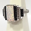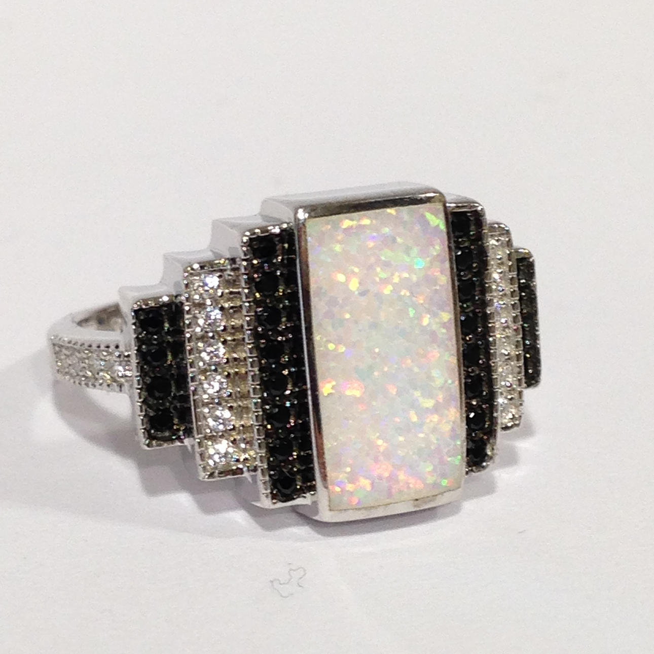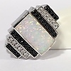 Opalitstenen er flankeret af tre rækker hvide og sorte runde brillantslebne cubic zirconia sten.