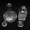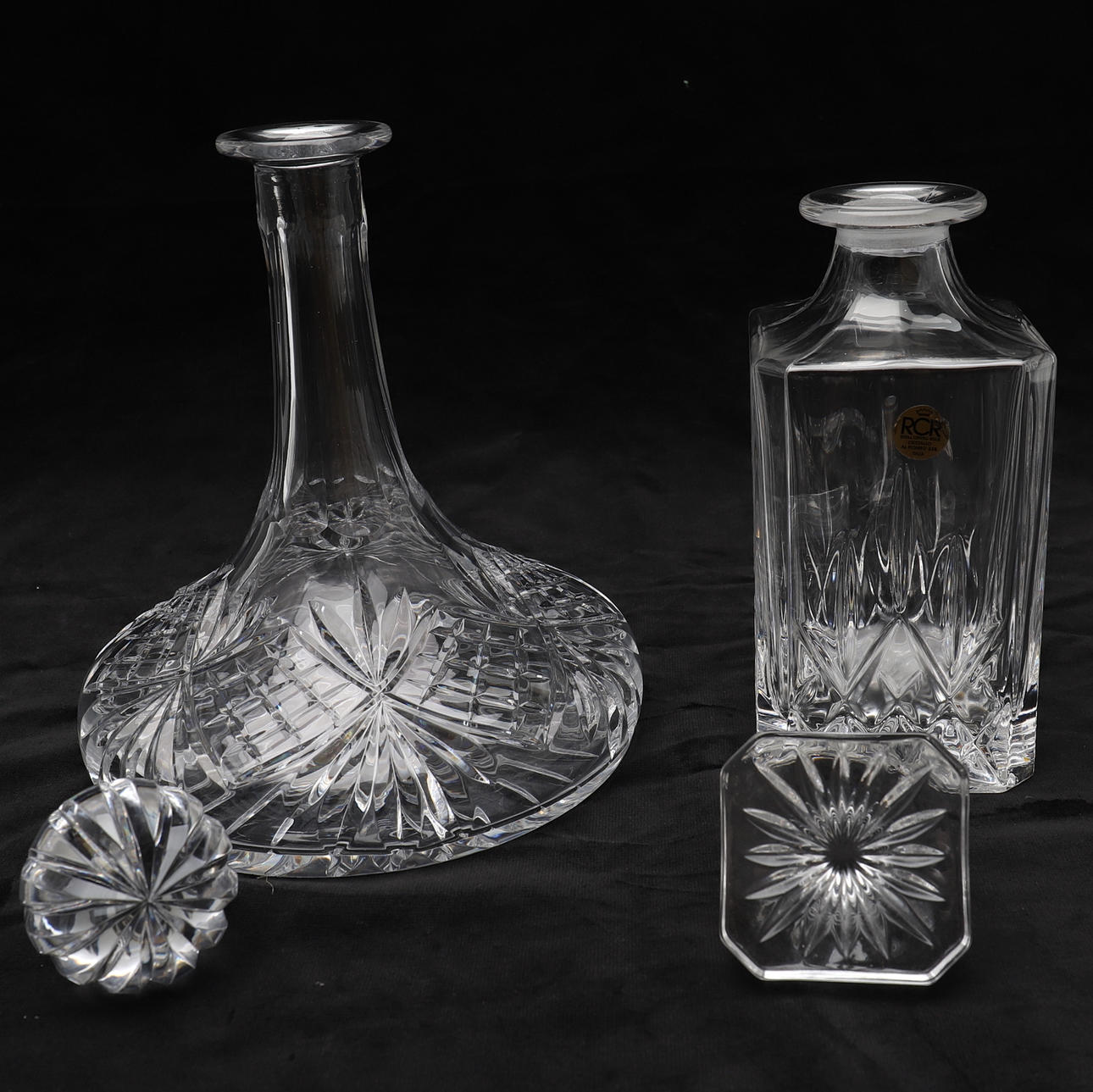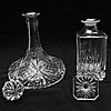 En moderne pressestøbt Royal Crystal Rock - Italien, firkantet spritkaraffel og prop, ca. 23 cm høj x 10 cm, med en lignende skibskaraffel og prop. Ca 26 cm høj x 20 cm.