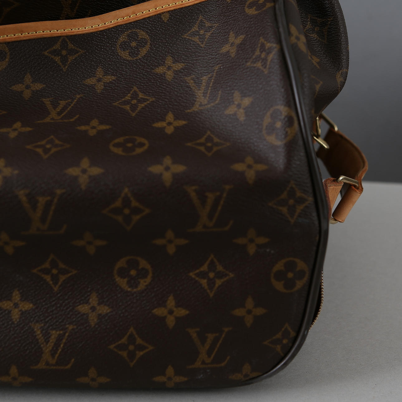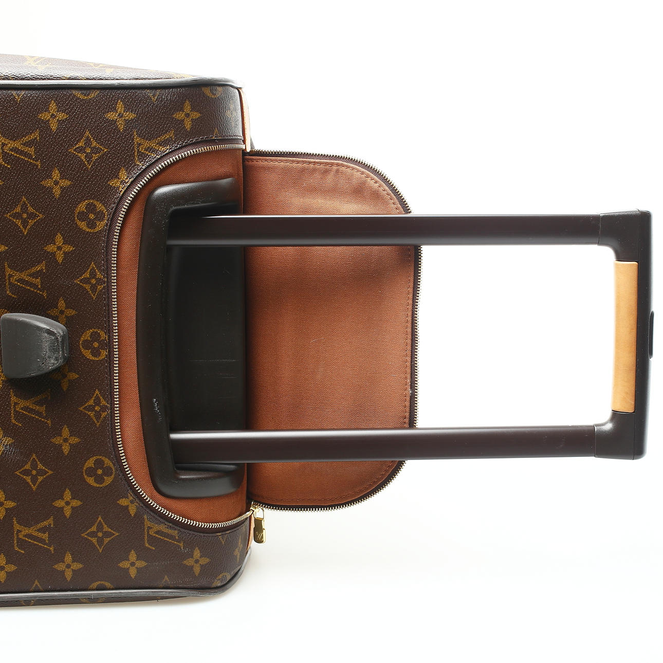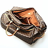 Rulletaske med monogram kanvas og hank. Siderum med lynlås og to trækflige. Brunt indvendigt for med to rum og et inderrum med dobbelt lynlås.