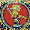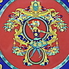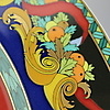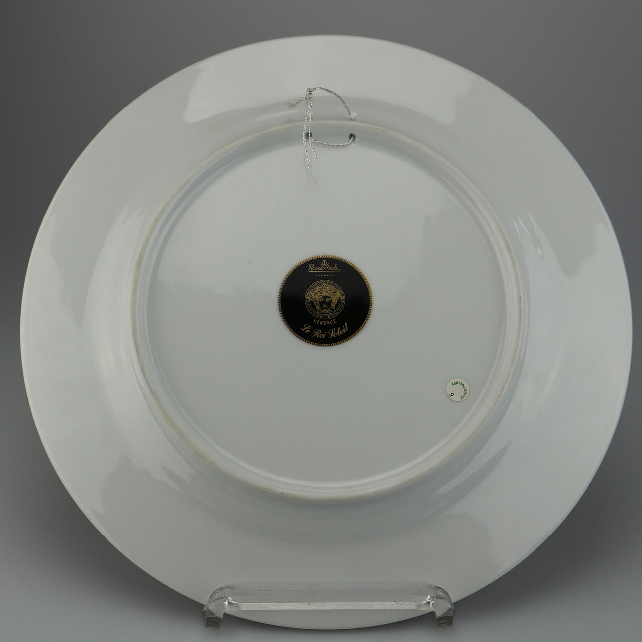 Rosenthal tallerken model Le Roi Soleil af Versace 25 Years Edition, 22 cm, Le Roi Soleil-motivet vækker minder om romerske mosaikker, pompeianske vægmalerier og sidst men ikke mindst om Versaces omfangsrige silketørklæder: et par dansere, en lille inkakonge, en høvisk udsending, omgivet af barokke guirlander, griffiner og sidst men ikke mindst solmasken.