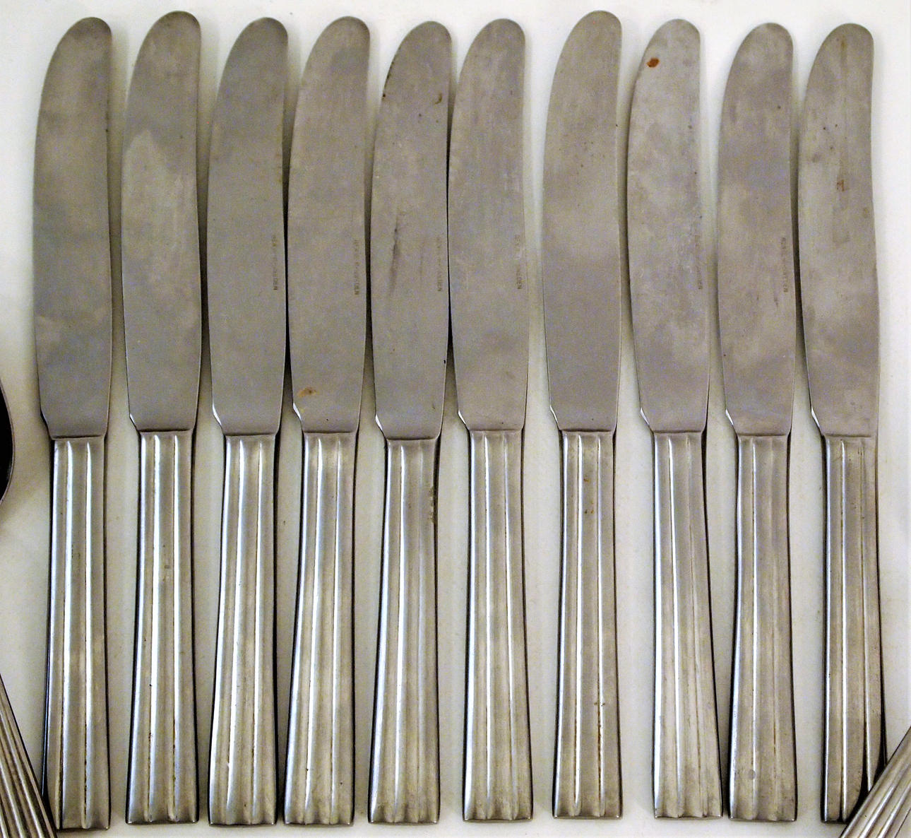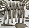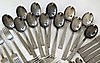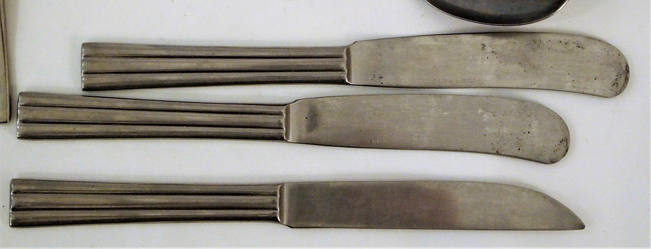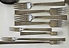 Middagsknive 10 stk længde 19,5 cm, smørknive 2 stk længde 18,5 cm, middagsskeer 12 stk 18 cm, dessertskeer 12 stk 17 cm, middagsgafler 12 stk 18 cm, knivspids 19 cm, dessertkagegafler 4 stk 15 cm spatel 21, 5 cm, kaffeskeer 4 stk 11,5 cm, gafler 2 stk 11,5 cm, cocktailgafler 2 stk 17,5 cm.