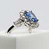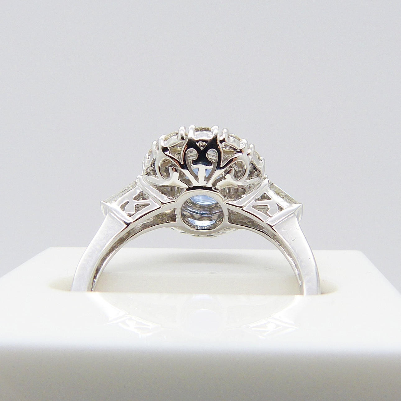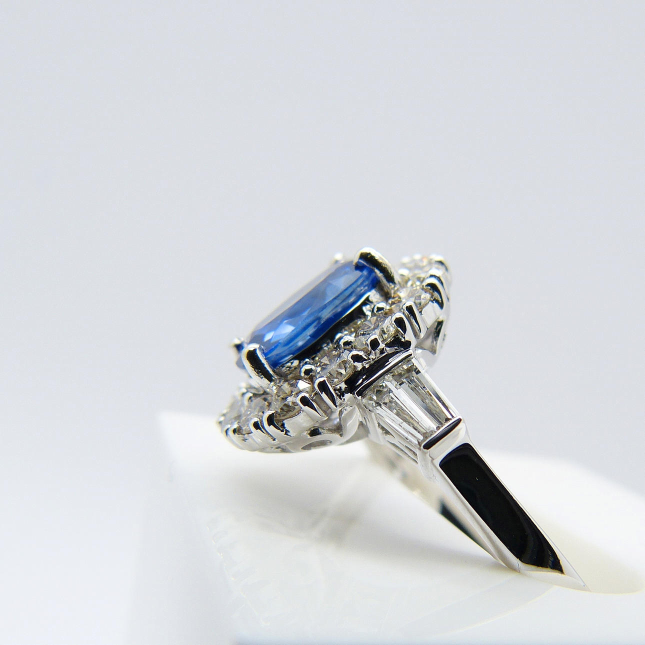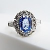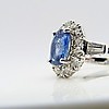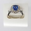 Omkring safir ædelstenen er 14 x runde, brillantslebne diamanter, hver sat i 4 kløer.